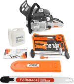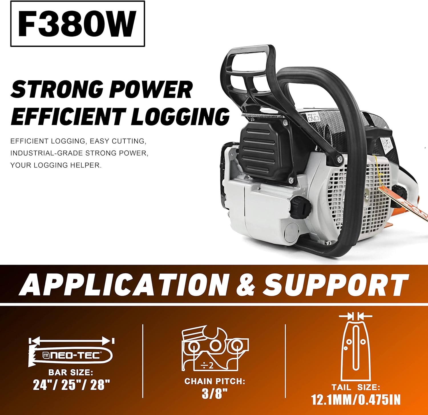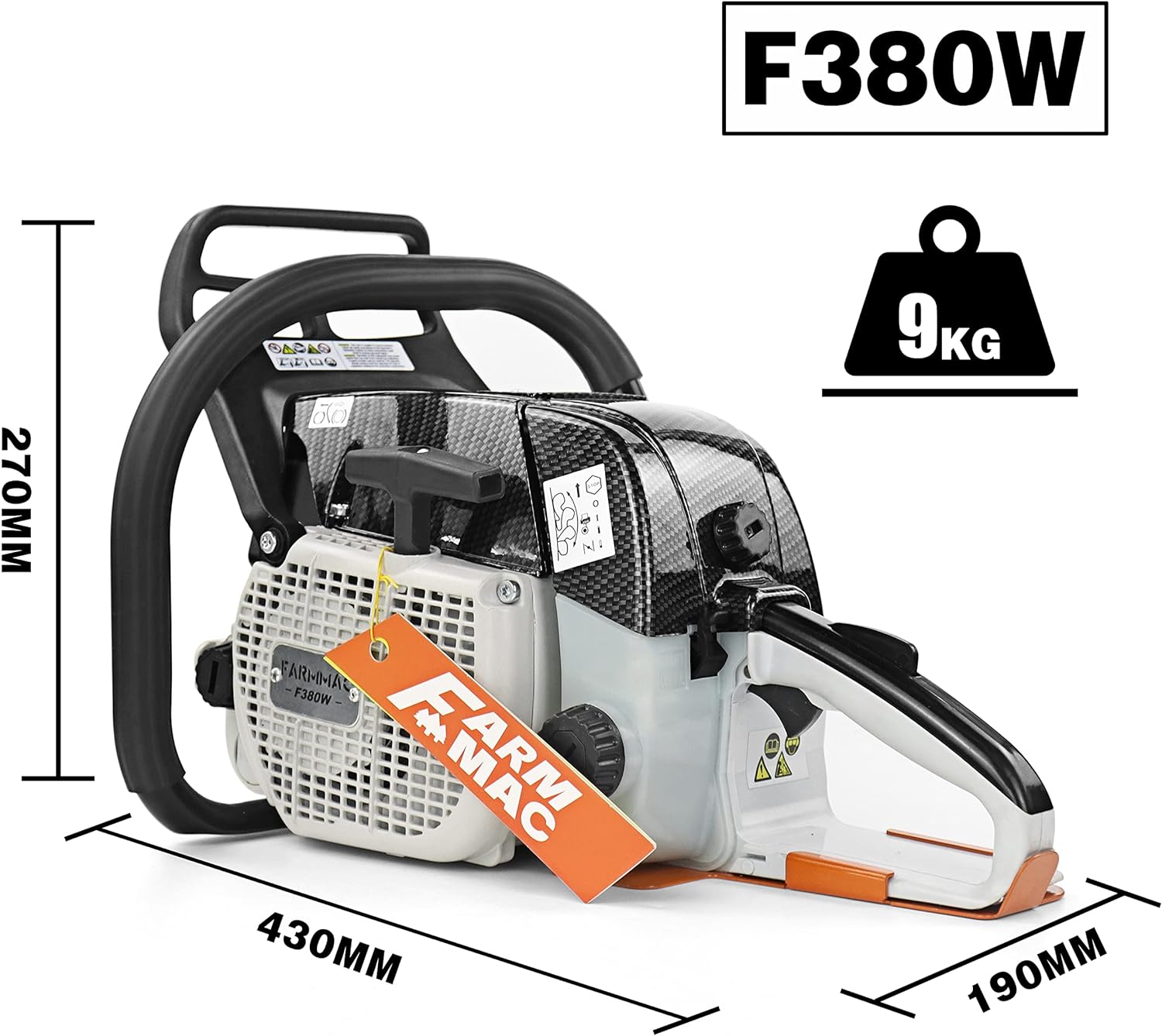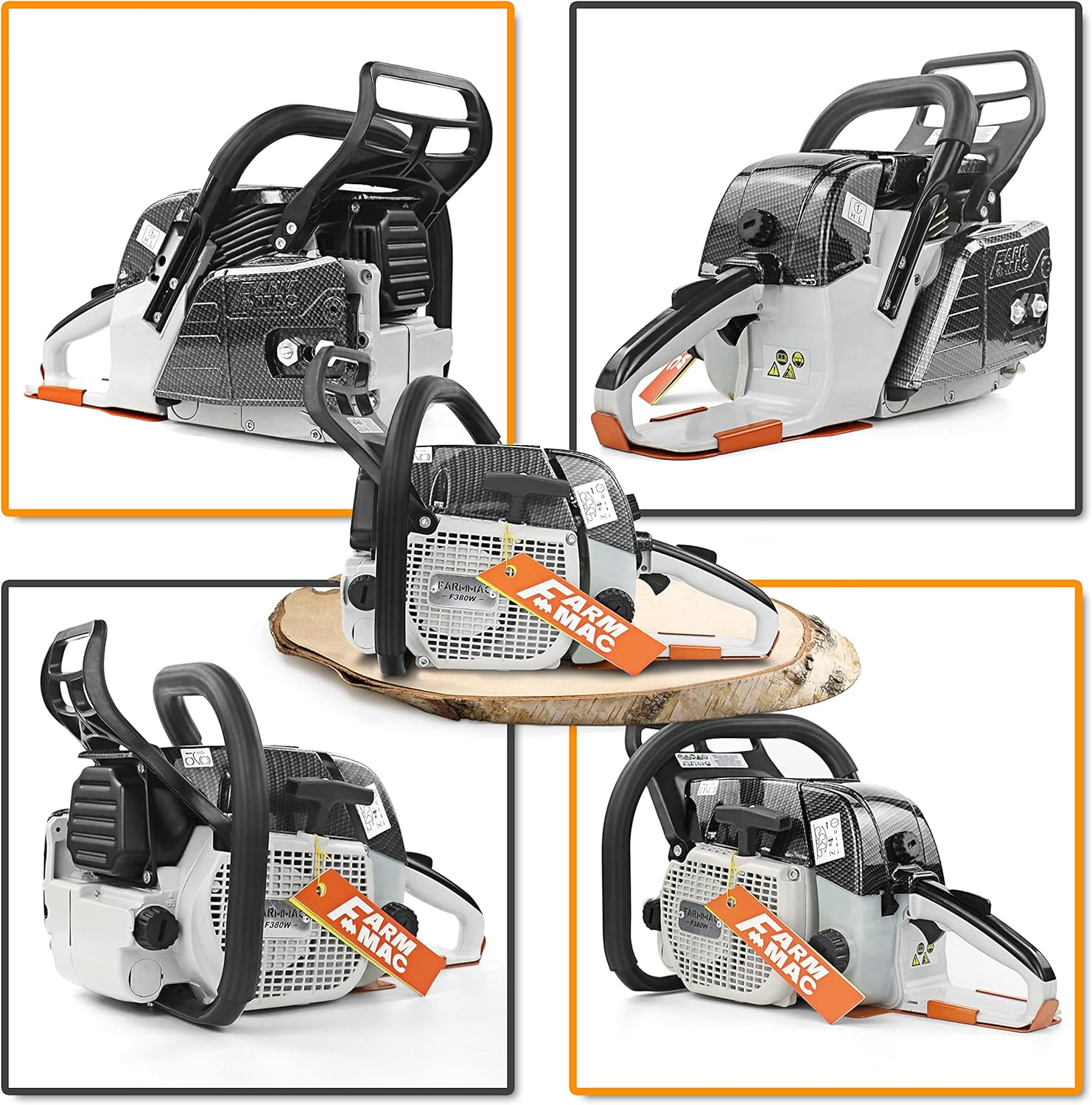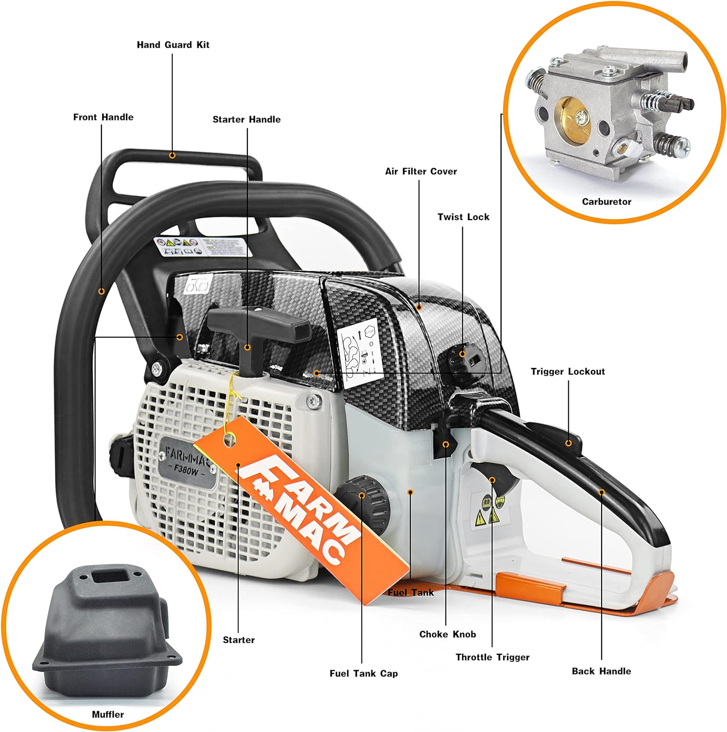 【PRO Commercial 72cc Gas Chain Saw】 – FARMMAC gas chain saw power head F380W compatible for Stihl MS381 MS380 038 Neotec NS872. Efficient 72cc full crank & excellent 2-cycle stroke air-cooled engine has better working power 3.6KW 4.8HP and fast air cooling system for overheating improving the engine power and efficiency