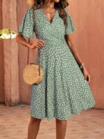 Features: Ruffle Short Sleeve/ Fixed Wrap V Neck/ Knee length/A Line/Empire Waist/Floral Print.