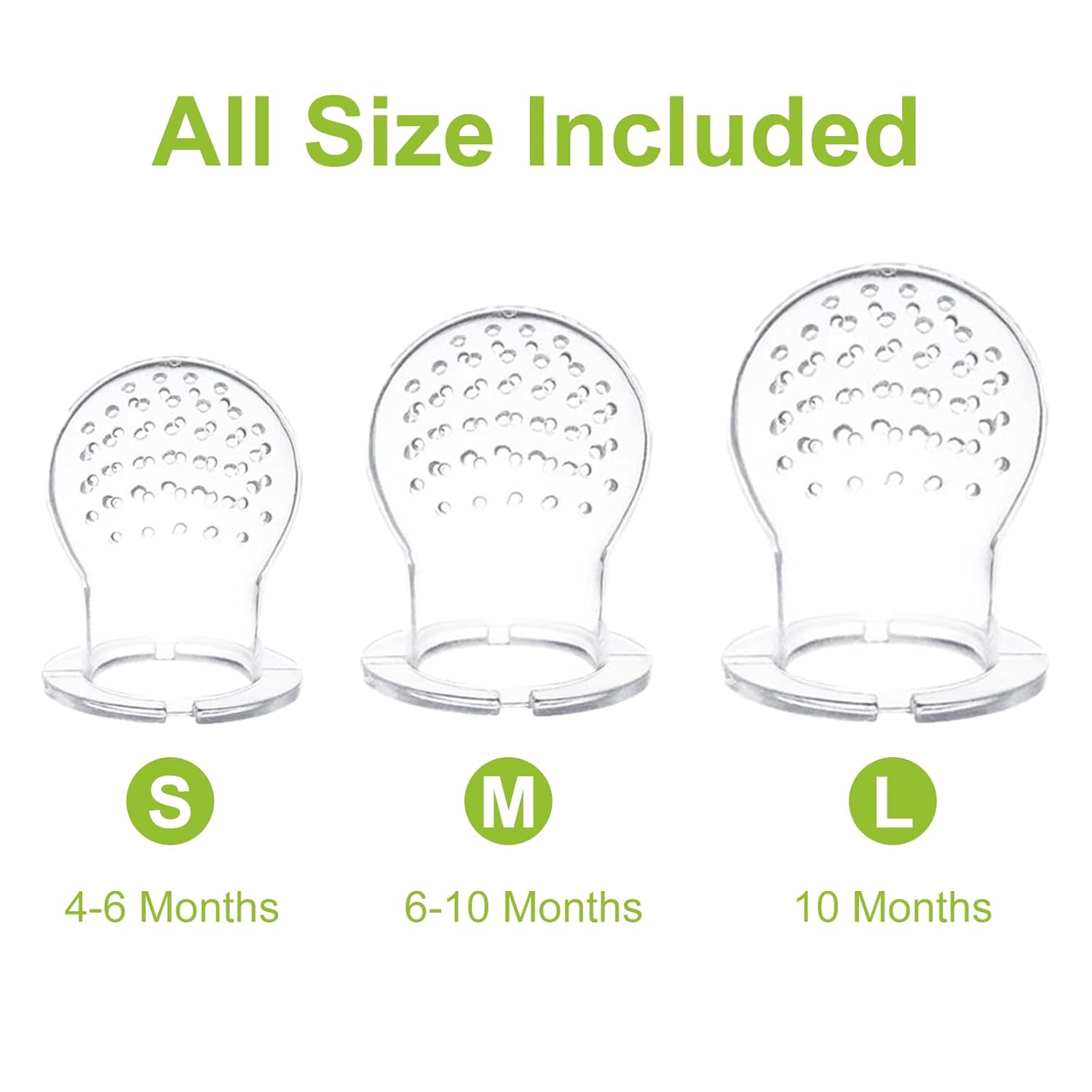 Baby Fruit Feeder Set :The baby food fresh fruit feeder pacifier set with 3 different sizes of silicone teats (S/M/L),S:can be put in fruit & vegetable ;M: pieces of fruit & vegetable ;L:minced meat or fish. the feeders are the gifts during baby weaningand ,baby can chew, suck and taste the whole food goodness, with only small pieces of fruit ,reducing the risk of choking.
