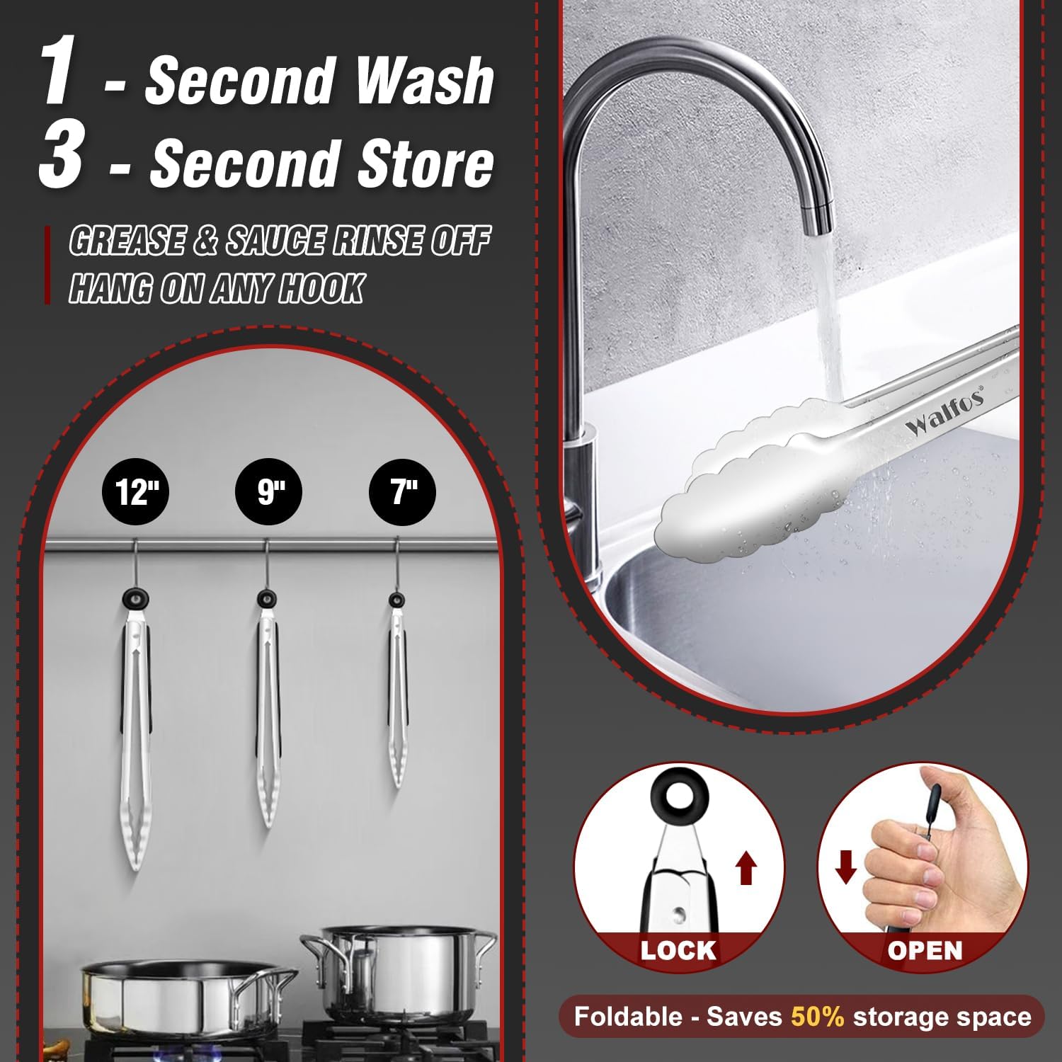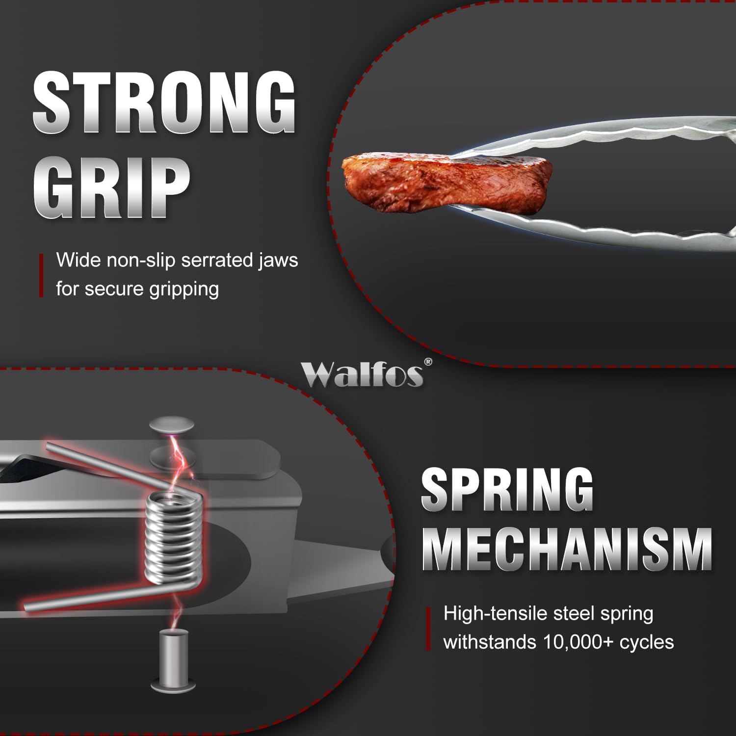 ★LOCKING MECHANISM & PULL-RING TECHNOLOGY -WALFOS ring-pull technology locking tongs will keep your tongs from opening and closing accidentally which will allow you to facilitate better control while using them. And can be conveniently dried and stored.