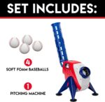 BALLS INCLUDED: This pitching machine comes with (4) compatible foam baseballs to put in the ball feeder, which can hold up to 9 balls at once.