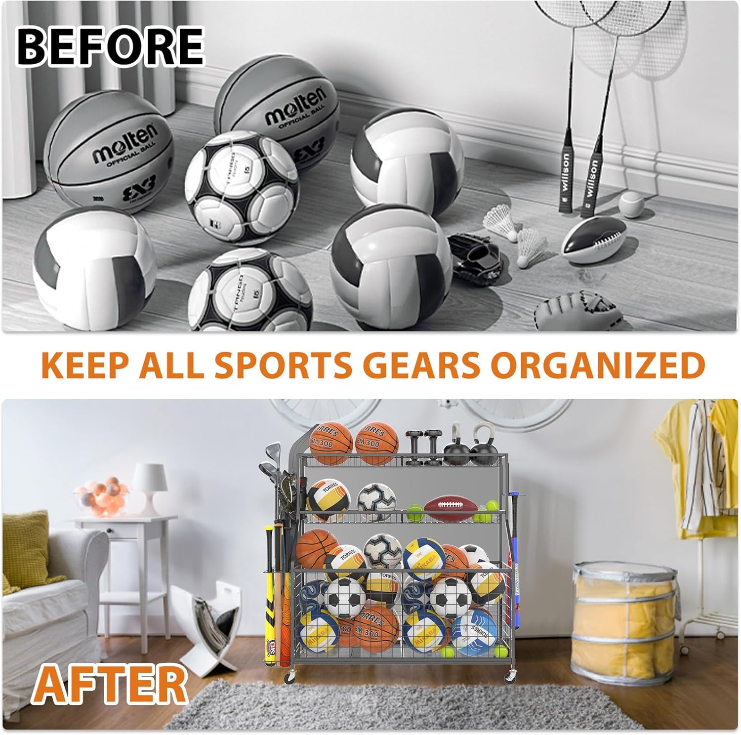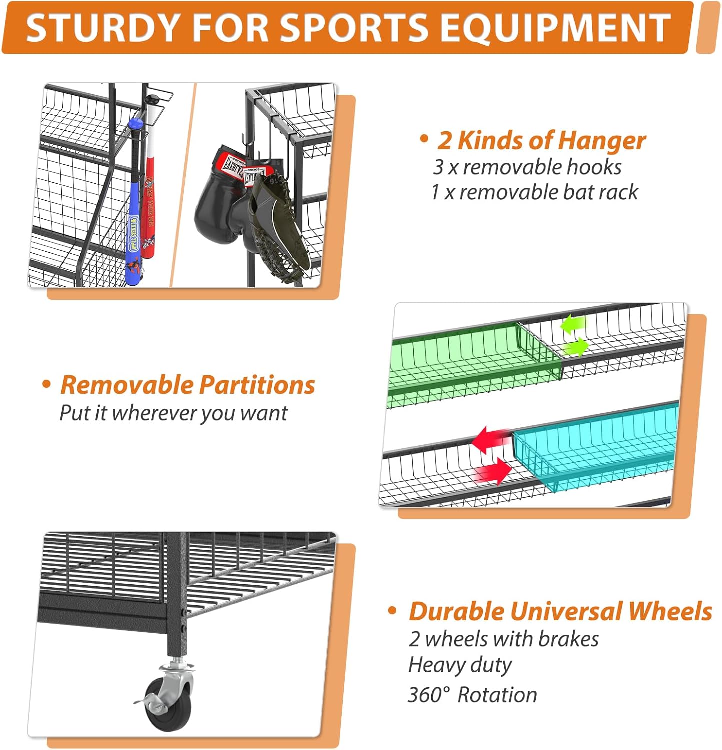 【Easy to Assemble】Easy-to-follow instructions ensure a quick and effortless assembly. Made of a durable coated steel frame, the sports gear organizer offers long-lasting strength and impressive performance