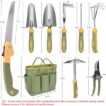 【What You Get】9-Piece Green garden tools set: Dual-purpose hoe, hand Rake, hand weeder, transplanter trowel, folding saw, pruning shears, garden trowel, crack weeder and garden tote storage bag. Nearly everything you need in daily garden maintenance. The ideal garden gift set for those who love outdoor gardening.