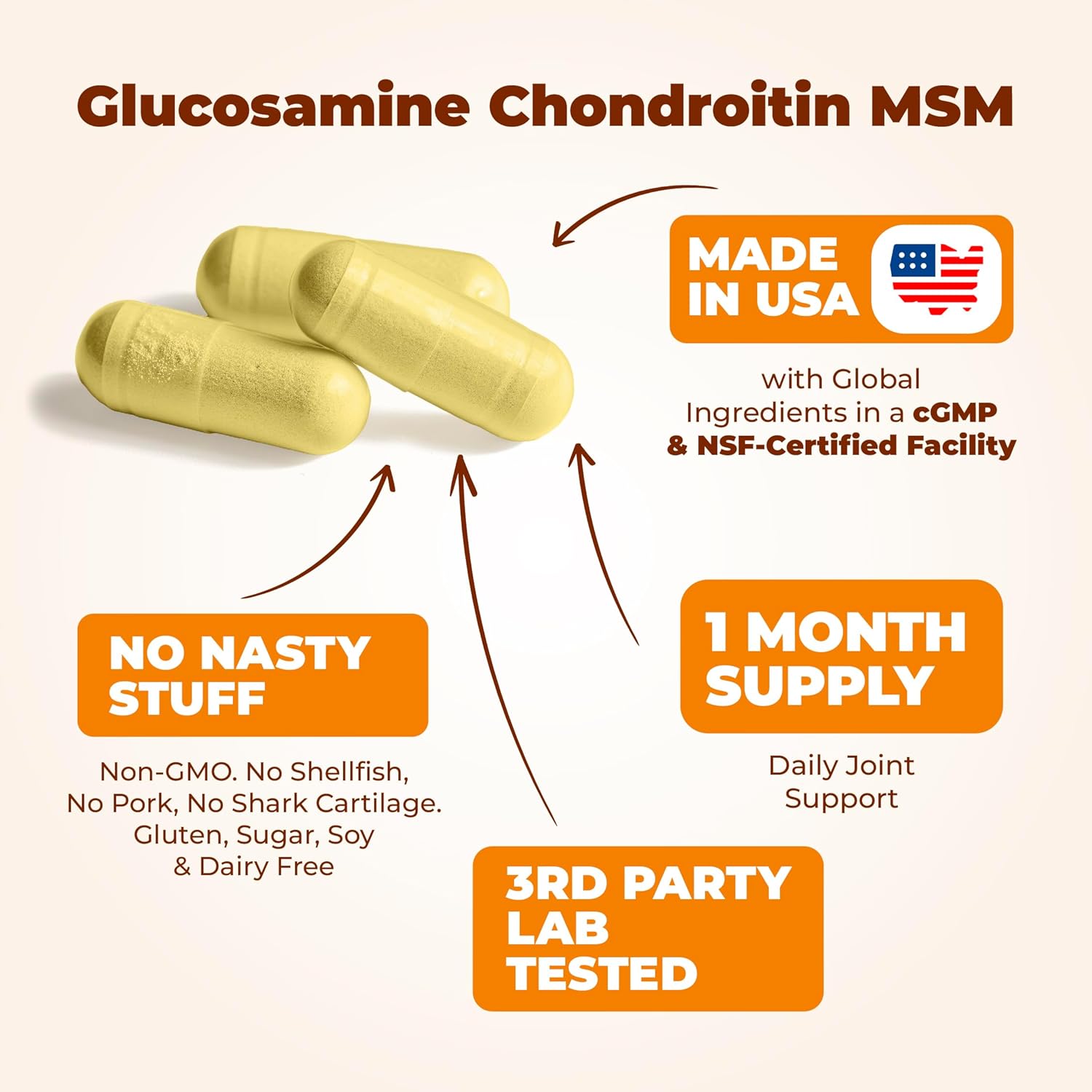 PREMIUM CHONDROITIN & GLUCOSAMINE NUTRITIONAL SUPPLEMENTS – Made in the USA in a cGMP & NSF-certified facility with globally-sourced ingredients. HSA/FSA eligible vitamins. Third-party tested for purity and potency. Easy-to-swallow capsules with no aftertaste. Non-GMO, gluten-free, dairy-free, soy-free, and shellfish-free. No pork. No shark cartilage. Trusted by health-conscious individuals seeking quality, efficacy, and affordability.*