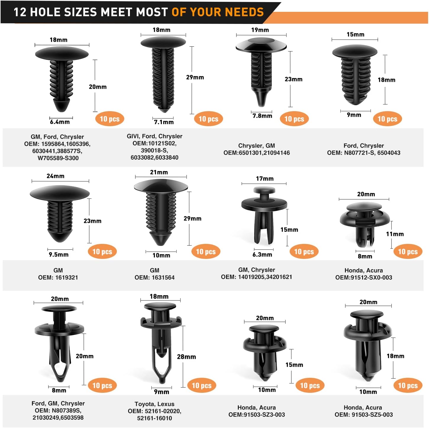 12 Most Popular Sizes : There are 12 most common sizes of clips which will meet your needs, sturdy and reusable, compatible for GM, Chrysler, Ford, Toyota, Mazda. Hyundai, Kia, AMC, Jeep, etc…