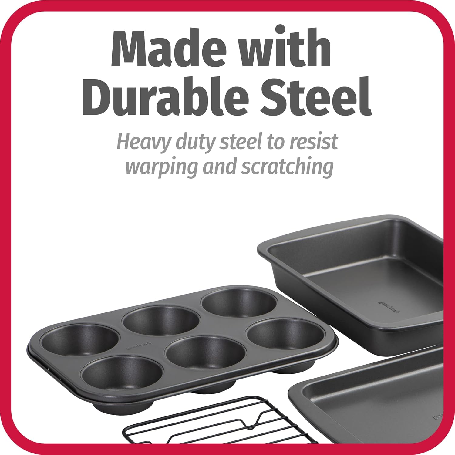SCRATCH-RESISTANT STEEL: Constructed from heavy-duty steel, this bakeware set resists warping and scratching to provide long-lasting durability and maintain daily use.