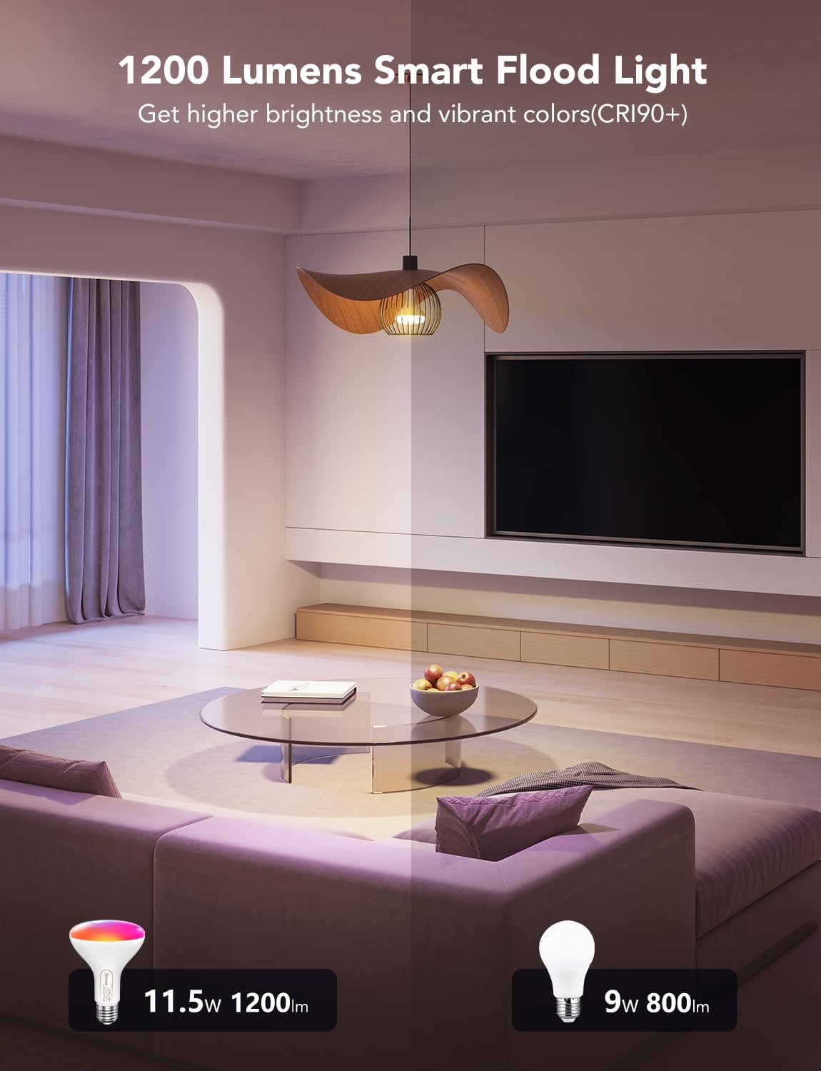 Higher Brightness: Producing much brighter light vs common standard 60W LED bulbs, these 1200 lumens BR30 smart bulbs are ideal for large areas. Get higher brightness (85W equivalent) and vibrant colors (CRI90+) while saving on your energy bill.