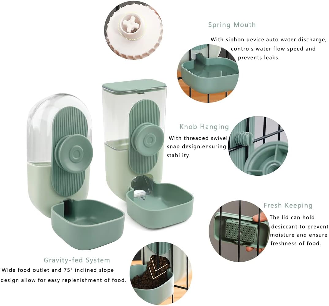 Hanging Cage Automatic Pet Food and Water Dispenser 35oz, Gravity Refill Food and Siphon Suction Water Set for Medium Small Animals Puppy Cat Rabbit Chinchilla and Ferret