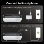 [ Compatibility Notice ] – This mini projector works with smartphones and tablets, but requires an HDMI adapter (not included). For iOS, use an official Lightning to HDMI adapter. For Android, if your phone supports MHL, use a Micro USB/Type-C to HDMI cable (not included); otherwise, a Chromecast is recommended for wireless mirroring. Enjoy a seamless big-screen experience with this versatile phone projector!