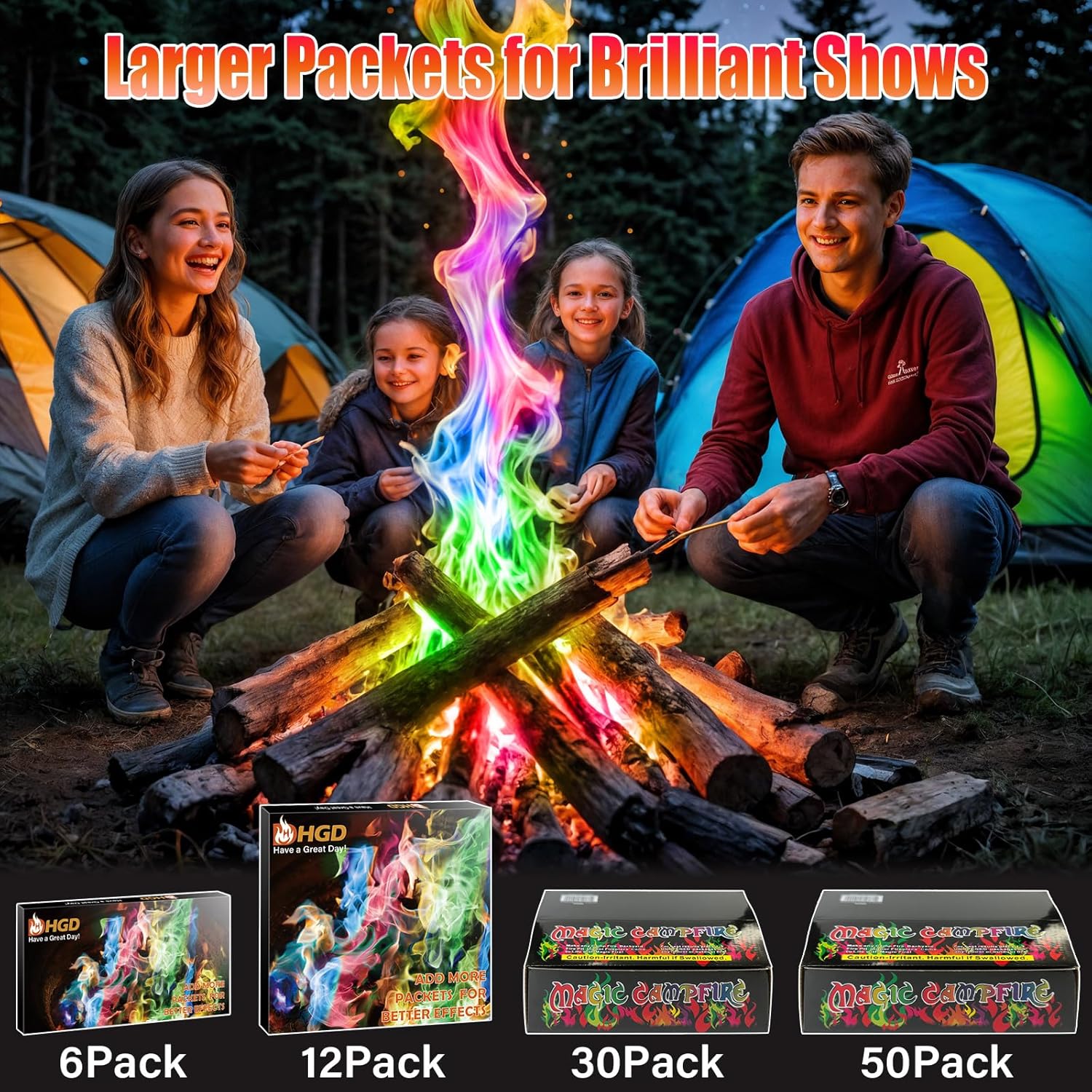 HGD (6 Pack) Magic Campfire Fire Color Changing Packets for Fire Pit, Indoor/Outdoor Fireplace, Bonfire – Rainbow Magical Flame, Camping Accessory, Compatible with Wood