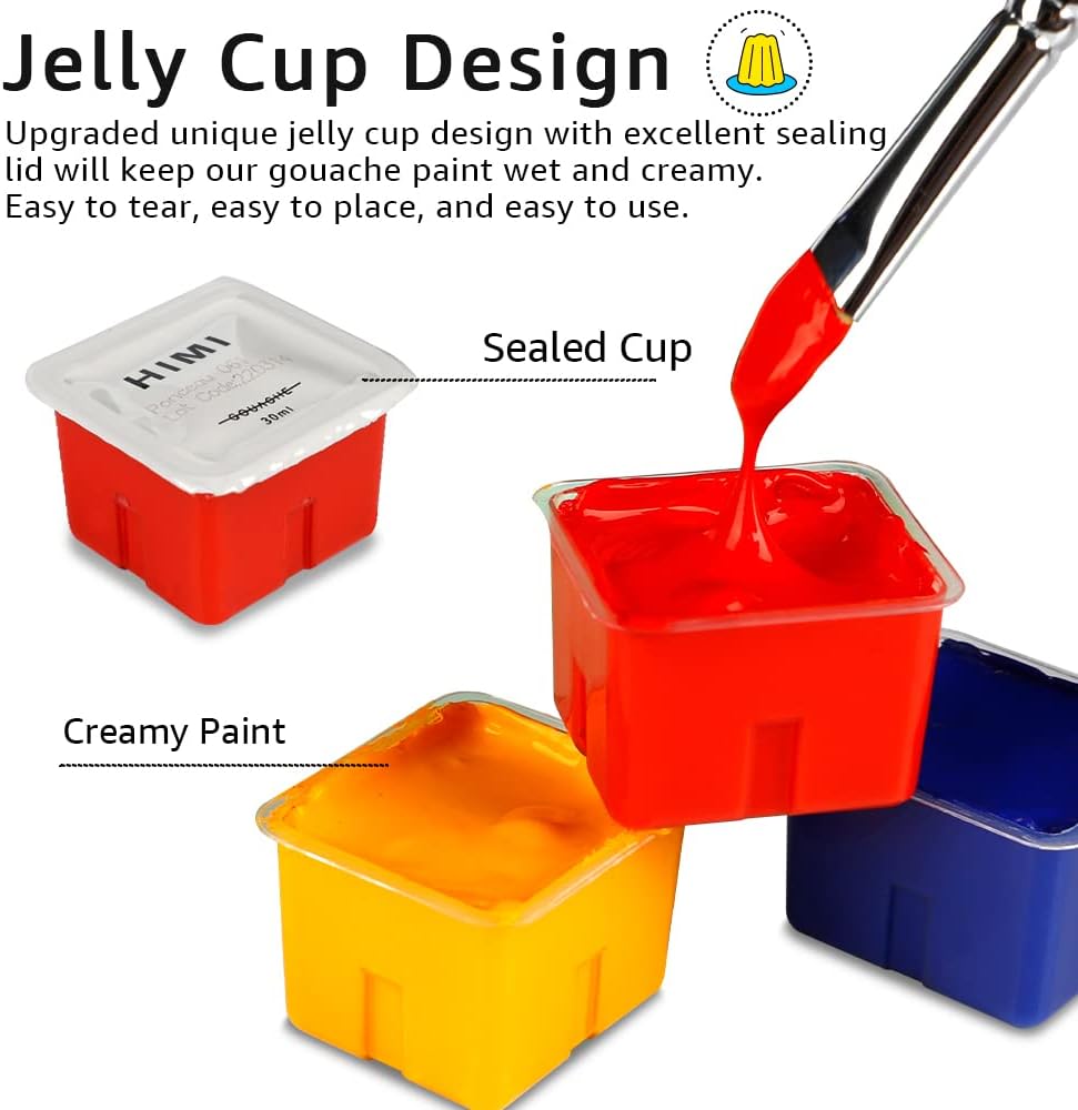 【Portable Gouache Paint Set】- Comes with 24 jelly cup gouache paint, a palette, and 3 premium paint brushes in a portable carrying case. The unique jelly cup design with an excellent sealing lid keeps our gouache pigments wet and creamy. The all-in-one design makes it easy to carry for both ladies and children. It is perfect for indoor, outdoor, and travel painting.