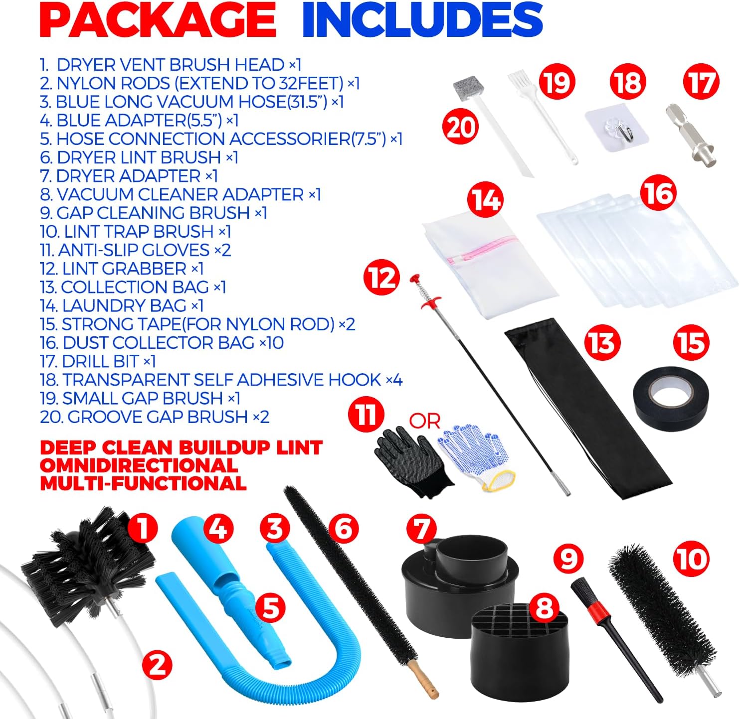 COMPREHENSIVE DRYER VENT CLEANER KIT: Premium dryer cleaning set will help you deep clean buildup lint in the dryer; Includes Dryer Vent Brush Set ×1,Dryer Lint Vacuum Attachment ×1,Dry Lint Brush ×1,Lint Trap Brush ×1,Vacuum Cleaner Adapter x1,Dryer Adapter x1, Lint Grabber x1,Collection Bag x1,Anti-Slip Gloves x1,Strong Tape(for nylon rod) x1, Dust Collector Bag x1