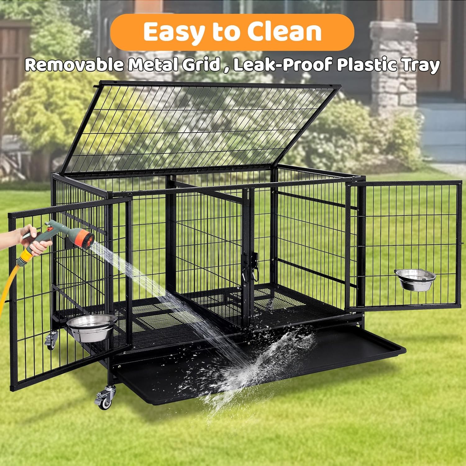 Two adjustable 304 stainless steel feeding bowls provide more convenience to feed your pet; Lockable wheels provide more convenience to move the cage