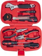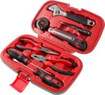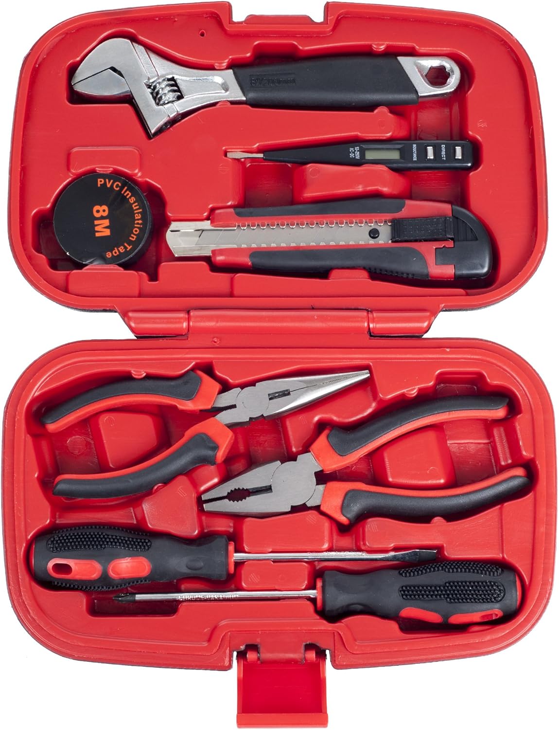 PRODUCT DETAILS – Materials: Plastic and Metal. Dimensions: Case: (L) 6.75″ x (W) 10.5″ x (H) 2.25″. Set includes 2 Screwdrivers, 2 Pliers, Large Box Cutter, Adjustable Wrench, 8-Meters PVC Insulation Tape, and 12-250V Voltage Tester. Color: Red.