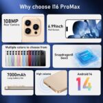 I16 ProMax Smartphone New Upgrade 12GB+512GB/6.99″ Display 68+108MP Zoom Camera,Tempered Glass Finish, 7000mAh Android 14 Smartphone (Gold)