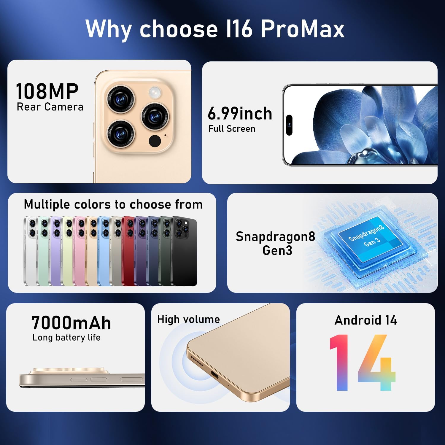 【New upgrade】:Our New I16 PRO MAX unlocked phones up to 12GB+512GB large memory is enough for social apps, games, movies and other applications. Adopts the powerful SM8550 8 Core CPU dramatically improve your phone’s running speed, network and screen smoothness, bringing you an unrivaled smooth experience.