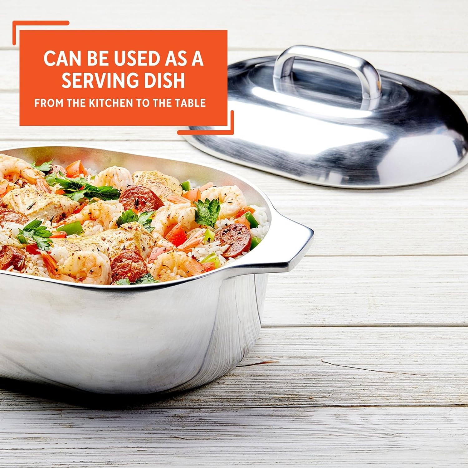 DURABLE AND ELEGANT: Made from durable cast aluminum, this oval roaster features a natural interior finish that promotes even cooking and a mirror-polished exterior for an elegant look in your kitchen