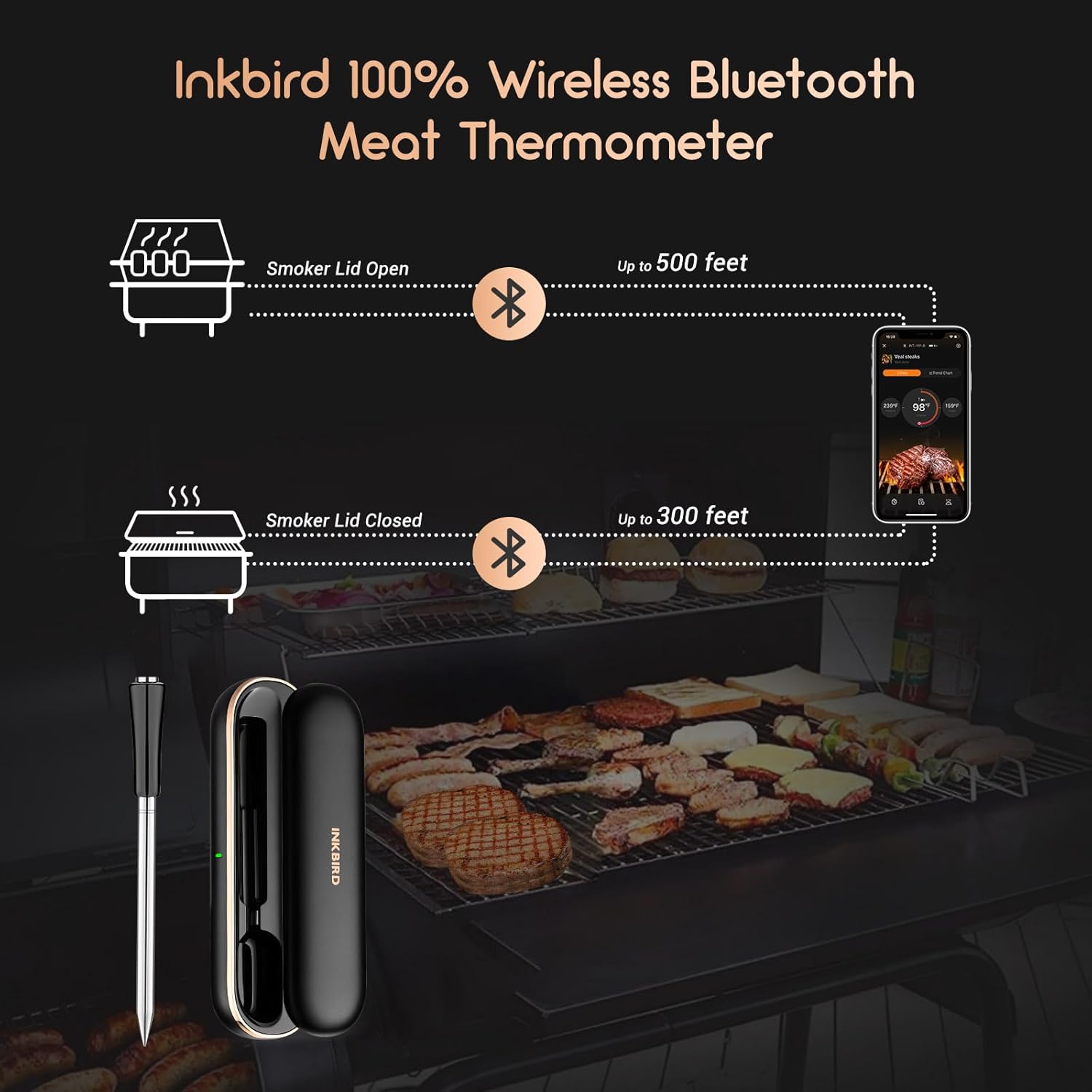 INKBIRD Meat Thermometer Wireless, Smart Bluetooth Meat Thermometer, IP67 Waterproof Wireless Meat Probe with Rechargeable Box for Outdoor Grill Smoker BBQ Rotisserie iOS & Android App
