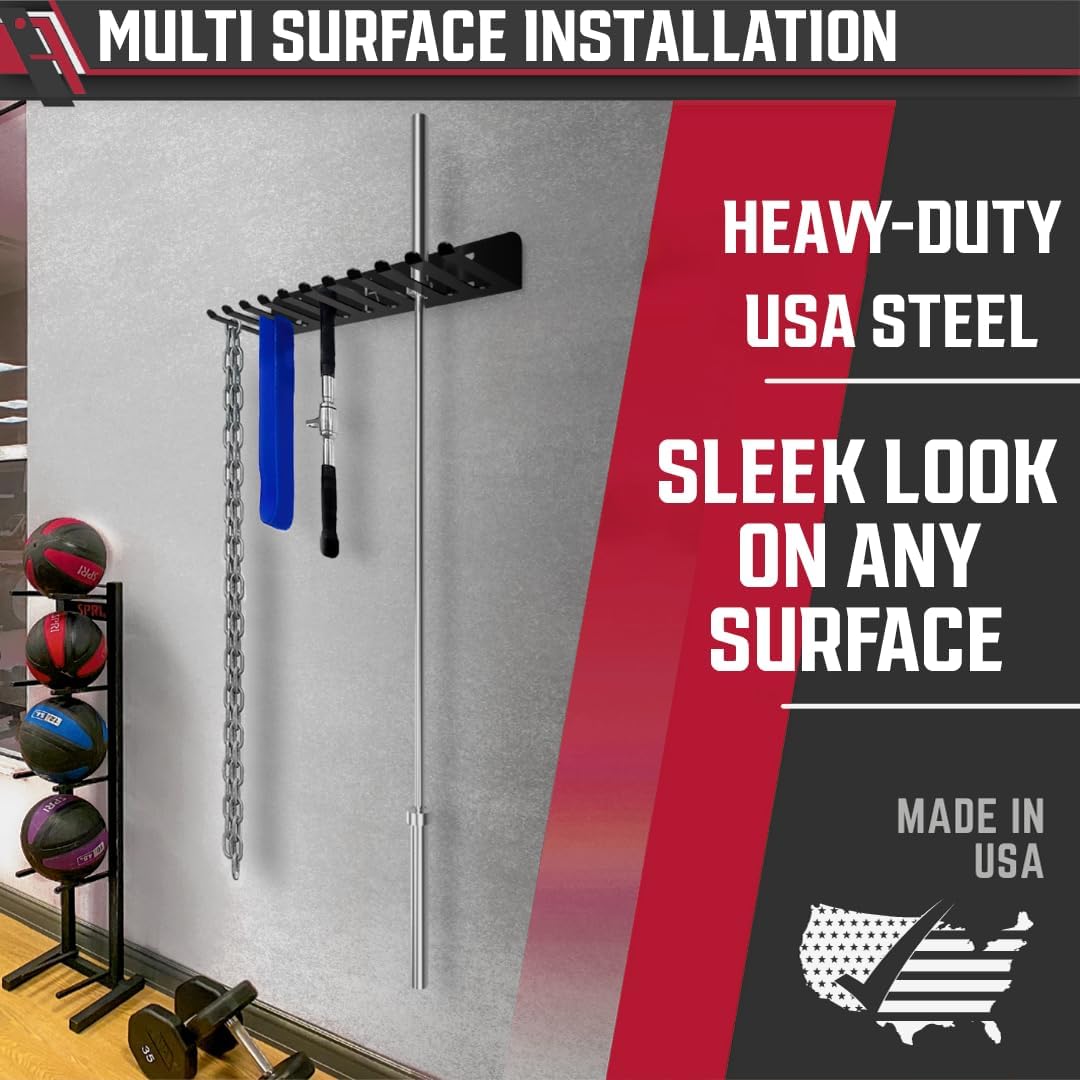 Multi-Purpose Home Gym Storage Hook Organizer: Use this gym accessory and barbell storage hanger for storing workout equipment – resistance bands, jump ropes, lifting belts, dip belts, agility bands, foam rollers, wrist wraps, curl bars, gym chains, and more hang precisely on our carefully designed hooks created to improve your wall organization.