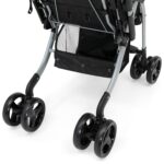 Smooth ride: 7″ front swivel lock wheels; 8″ shock absorbing back wheels–linked brakes lock both rear wheels by pressing a single pedal; Assembled dimensions: 33.9″L x 20.5″W x 42.9″H; Folded dimensions: 21.3″L x 9.8″W x 31″H; Weight: 20.9 pounds