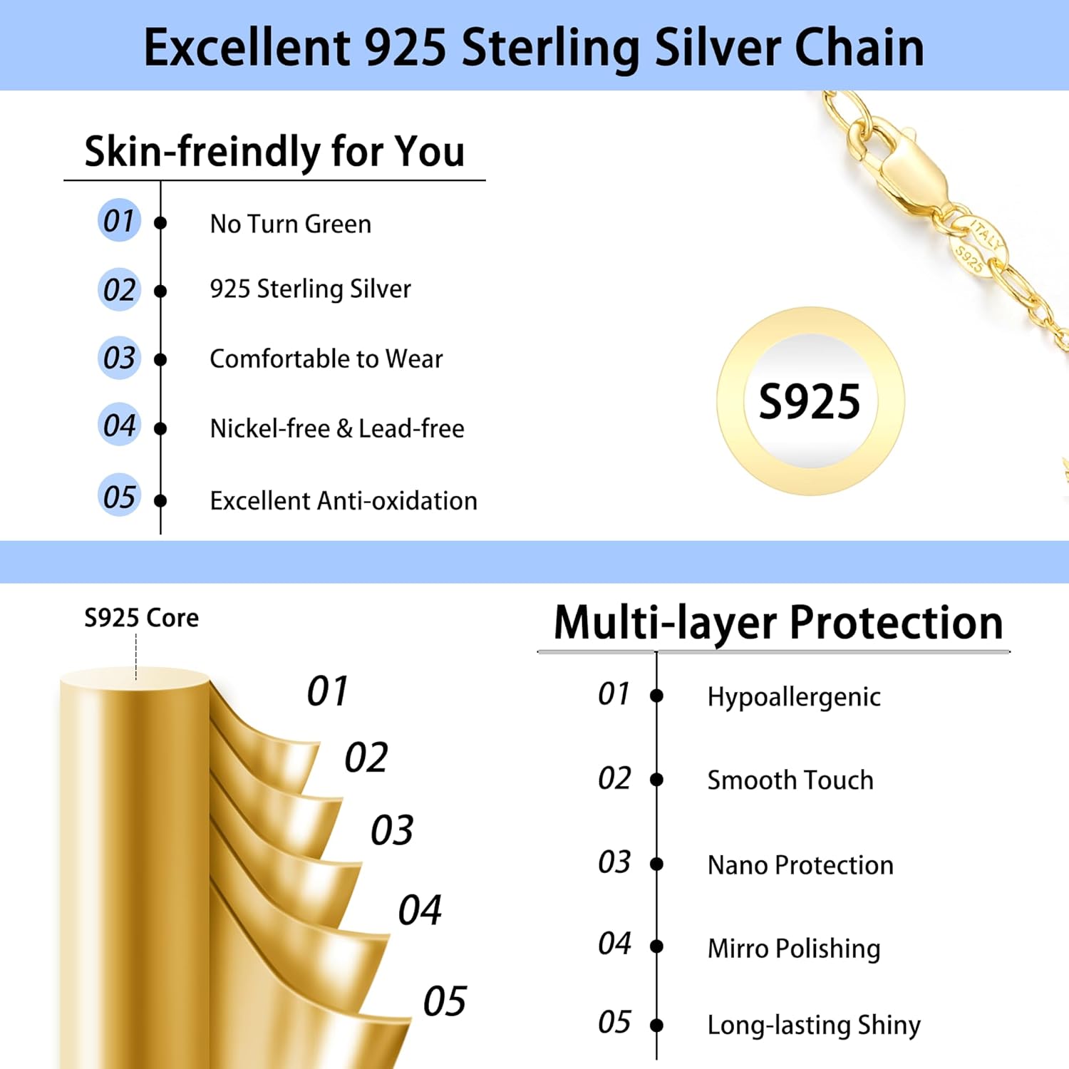 Jewlpire Solid 18k Gold Over 925 Sterling Silver Chain Necklace for Women, 1.1mm Cable Chain Necklace Thin & Dainty & Sturdy Women’s Chain Necklaces, 14/16/17/18/20/22/24 Inches