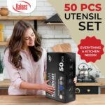 Complete 50Pcs Set: The Kaluns utensil set includes everything you need for a complete cooking experience. You’ll receive: slotted turner, ladle, salad spoon, solid turner, solid spoon, pasta server, slotted spoon, skimmer, spatula, utensil rest, can opener, egg separator, small spatula, spatula spoon, kitchen shears, 12” tongs, 12 x kitchen hooks, 5 x measuring cups, 5 x chip clips and 5 x measuring spoons, can opener, grater, pizza cutter, veggie peeler, ice cream scoop, a total of 50 pieces!