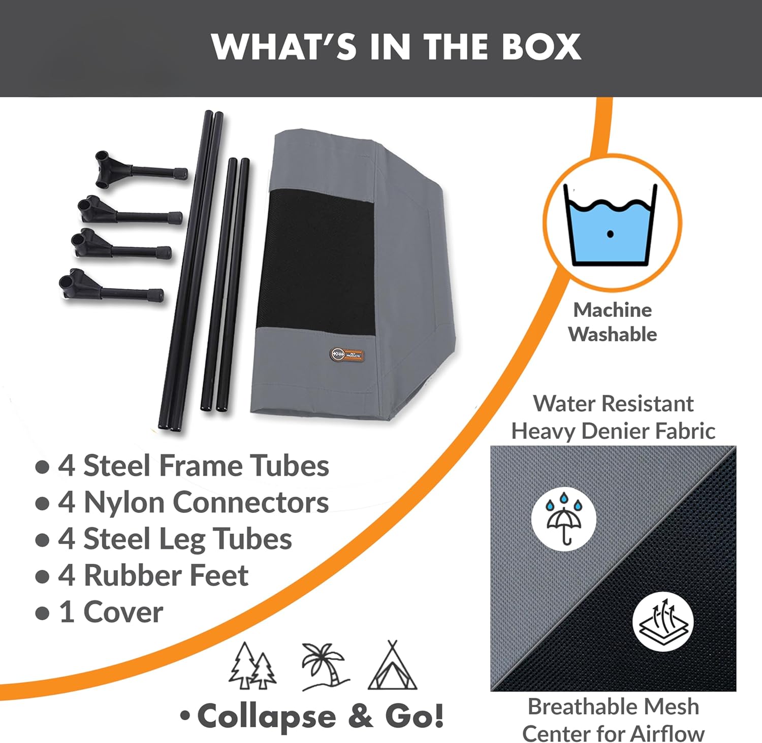 HEAVY WEIGHT CAPACITY: Our large dog cot boasts a lightweight metal frame and heavy denier cover, supporting over 200 pounds with ease, perfect for large dog breeds
