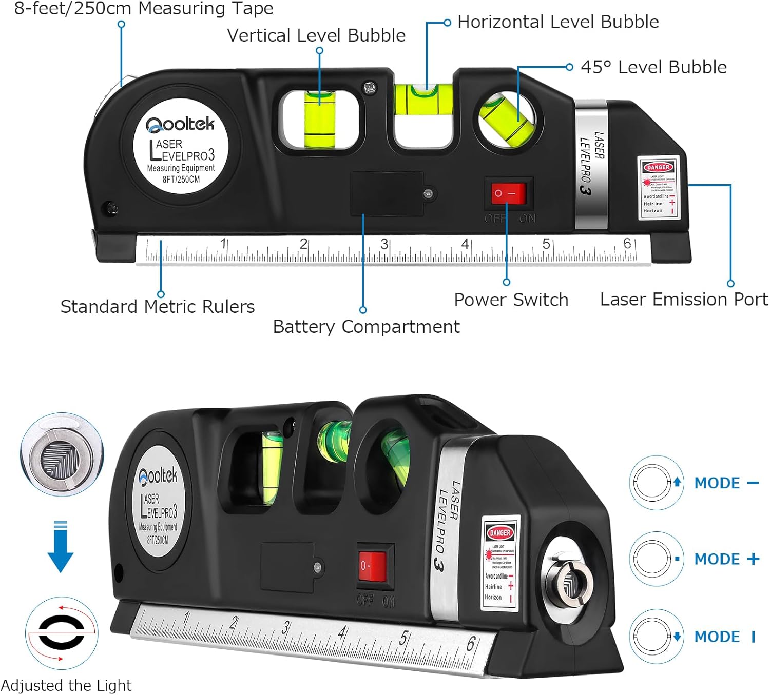 【ACCURATE MULTI-FUNCTIONALITY】This laser level tool integrates a 3-pronged approach with a fine-tuned 8-foot measuring tape, triple-positioned leveling bubble (0°, 90°, and 45°), and laser level modes (vertical, horizontal, and cross). It ensures accurate results for projects like hanging shelves, aligning frames, and leveling curtains or wallpaper. The precision is enhanced with graduations down to 1/32” and 1mm, making it a reliable tool for detailed measurements.