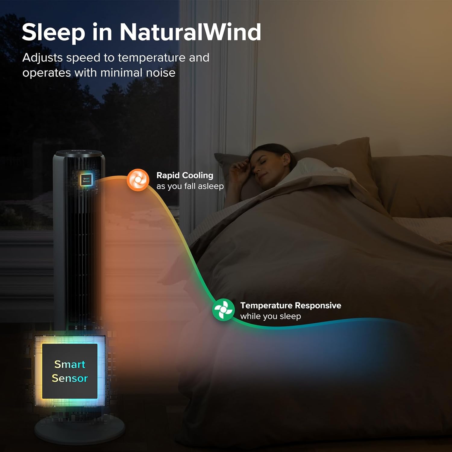 𝘿𝙮𝙣𝙖𝙢𝙞𝙘 𝘾𝙤𝙢𝙛𝙤𝙧𝙩 𝙒𝙞𝙩𝙝 𝙏𝙚𝙢𝙥𝙚𝙧𝙖𝙩𝙪𝙧𝙚 𝙎𝙚𝙣𝙨𝙤𝙧: This fan adjusts airflow based on room temperature using smart sensors, ensuring optimal comfort levels without overheating or freezing