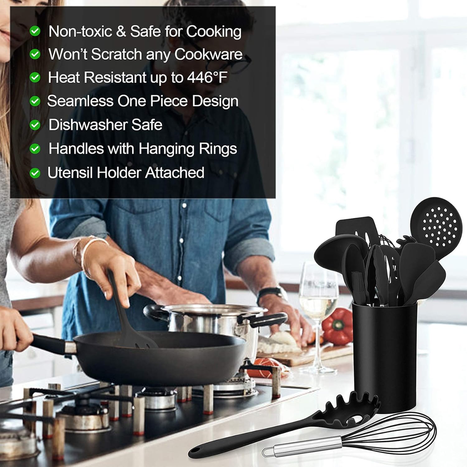 Silicone material, our black kitchen utensils are made out of food grade silicone which is safe for cooking, great set of silicone utensils to protect your nonstick cookware, would not scratch any pots or pans