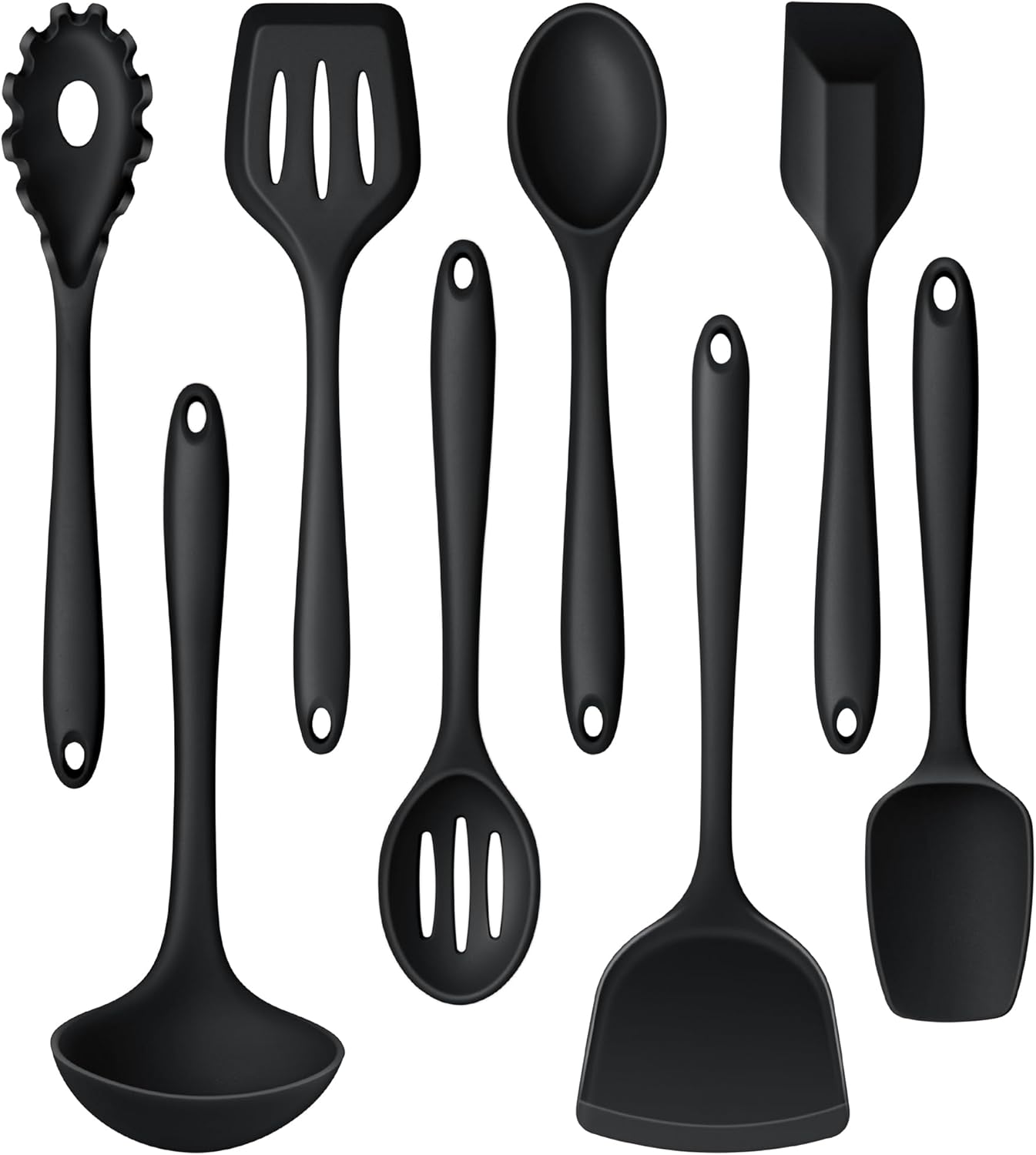 LIANYU 8Pcs Cooking Utensils Set, Heat Resistant Kitchen Utensils, Silicone Utensils Spatula Set for Nonstick Cookware with Spatula, Ladle, Turner, Spoon, Dishwasher Safe, Black