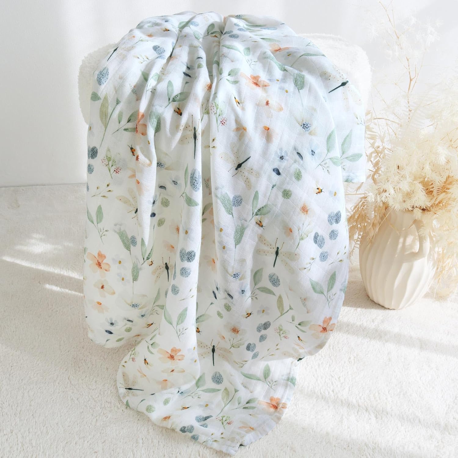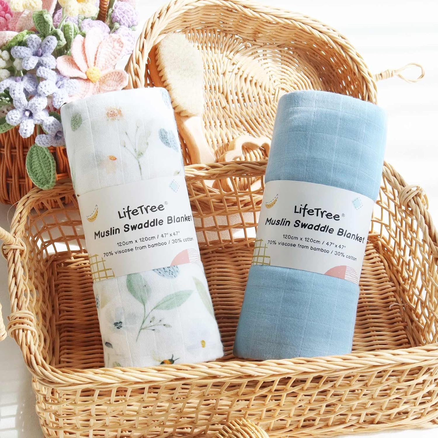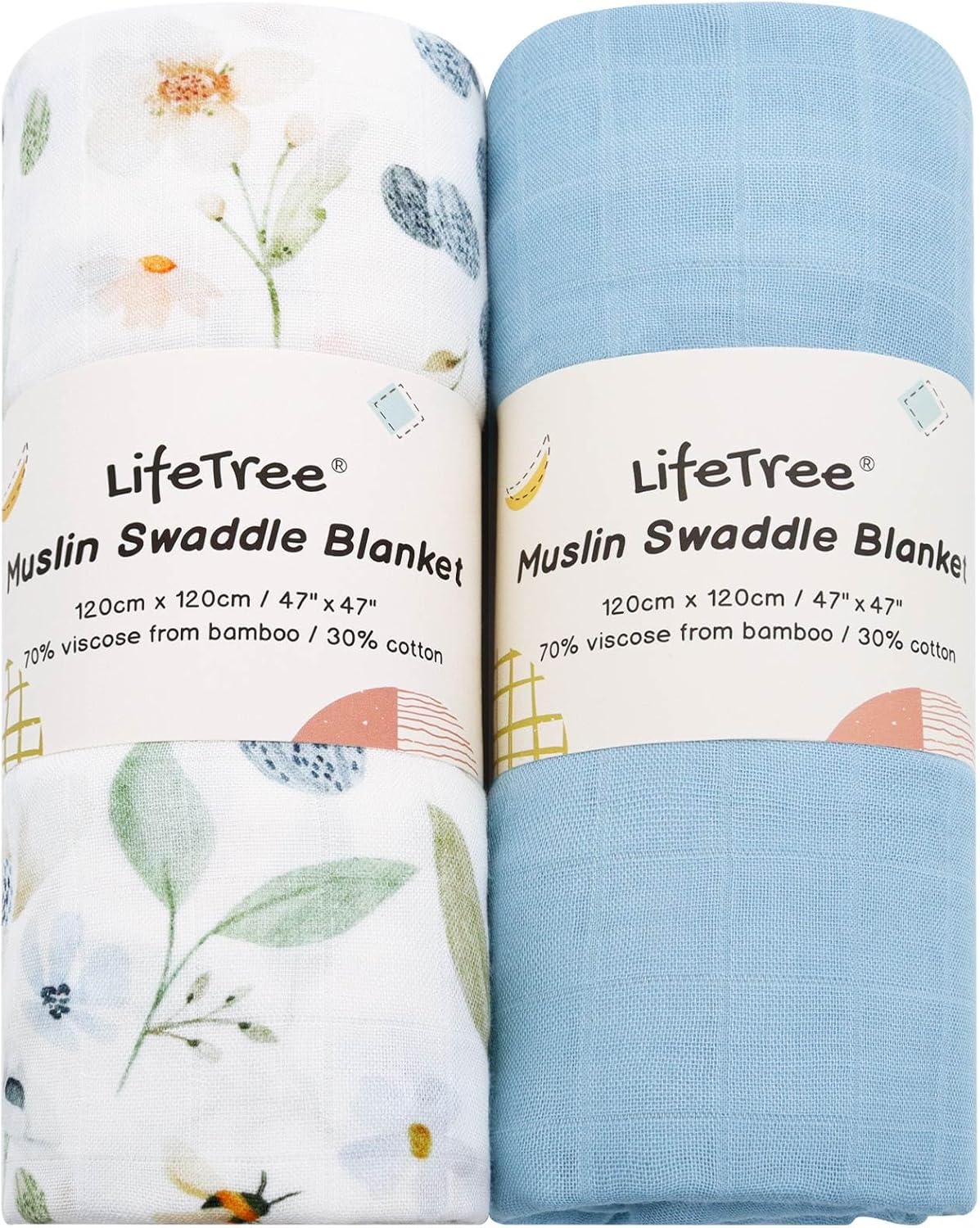 LifeTree Baby Swaddle Blanket, 70% Viscose from Bamboo and 30% Cotton Muslin Baby Blankets Unisex for Newborn, Super Soft Large 47″ x 47″, 2 Pack Floral and Blue Pattern
