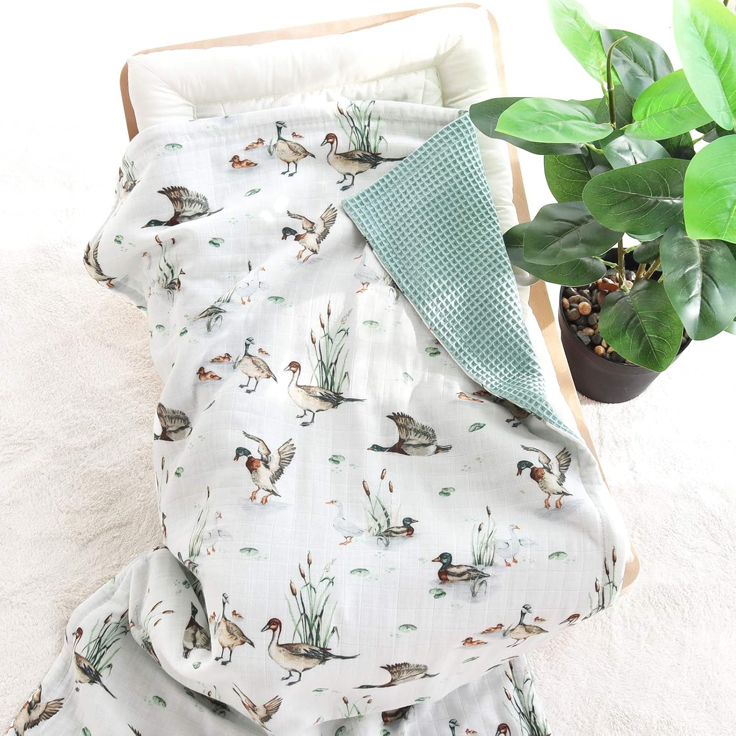 LifeTree Waffle Baby Blankets, Muslin Swaddle Blanket for Boys Girls, 2 Layers Crib Stroller Receiving Blankets with Muslin Front and Waffle Backing Infant Newborn Mallard Duck