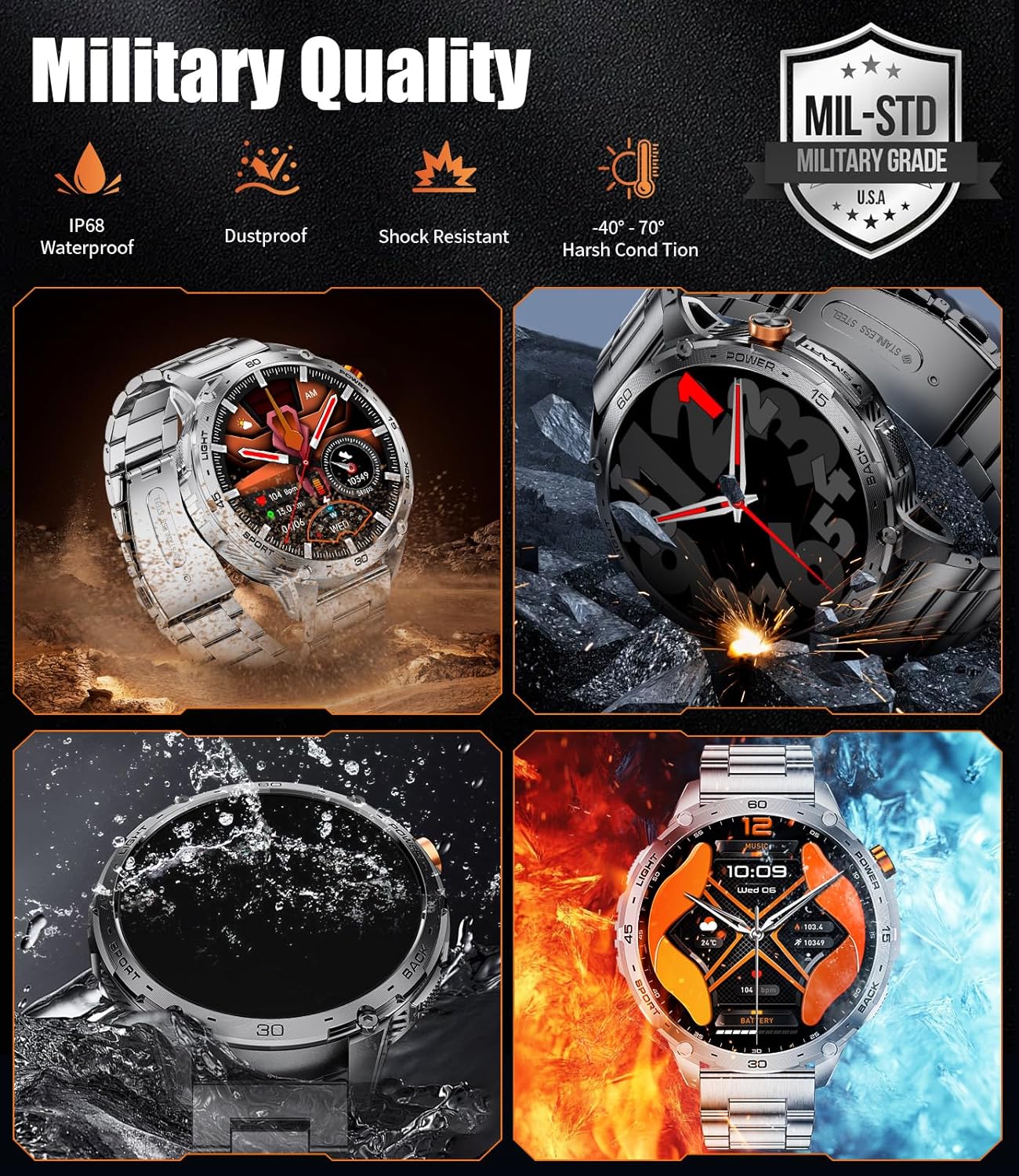 【BLUETOOTH CALLS & APP NOTIFICATIONS】:This mens smart watch supports Bluetooth calls, you can manage incoming calls directly on your wrist, including answering and rejecting. Meanwhile, the watch can receive notifications from apps such as WhatsApp, Instagram and Facebook, ensuring you don’t miss any important moments.