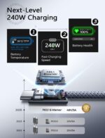 [NEXT-GEN CABLE CHIP TECH] This 240W USB C cable harnesses PD3.1 Extended Power Range (EPR) technology to deliver groundbreaking 48V/5A charging – the only solution supporting next-gen 240W devices like MacBook M4 while backward-compatible with 60W/100W/140W electronics. Unlike basic E-Marker chips limited to 100W protocols, our EPR + E-Marker system intelligently prioritizes device power needs. Featuring advanced voltage stabilization and dual safeguards (overheat + surge protection).
