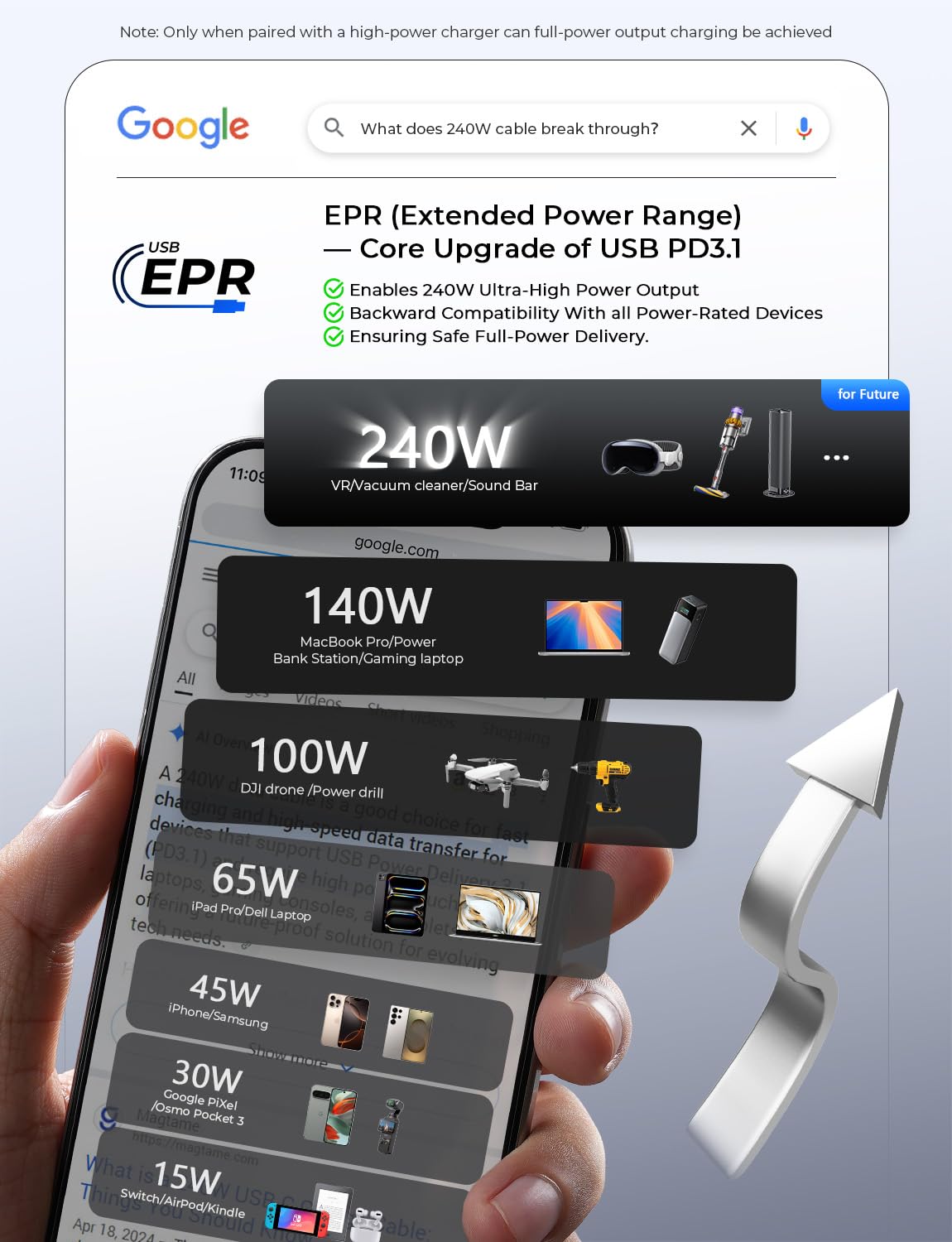 [FUTURE-PROOF COMPATIBILITY] 240W USBC to USBC Cable with Adaptive Power Delivery, Compatible with all current & upcoming devices: for iPhone 16/16 Pro/16 Pro Max/15 Pro/15 Pro Max; for Samsung Galaxy S25 Ultra/S24 Ultra; for Google Pixel 9 Pro/9/8 Pro/8; for iPad Pro 13″ M4/11″ M4/Air M3; for MacBook Pro M4 Max/M3 Max; for Surface Pro 11/10; for XPS 15/17; for DJI Mavic 4 Pro/Air 3; for ROG Zephyrus G16/Razer Blade 16; for Kindle 11/Paperwhite 6; for Meta Quest 3/2; for High-wattage power bank
