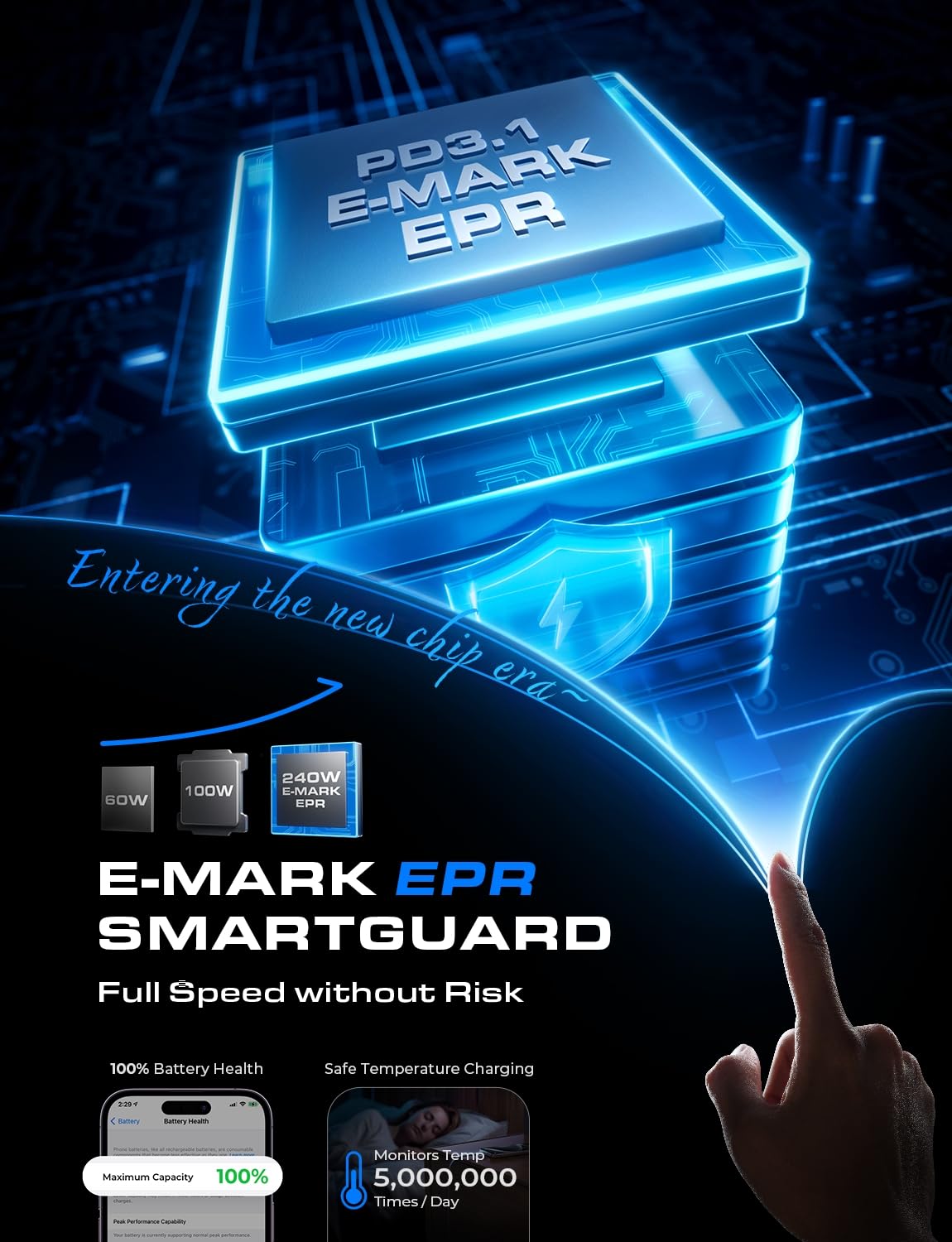 [NEXT-GEN CABLE CHIP TECH] This 240W USB C cable harnesses PD3.1 Extended Power Range (EPR) technology to deliver groundbreaking 48V/5A charging – the only solution supporting next-gen 240W devices like MacBook M4 while backward-compatible with 60W/100W/140W electronics. Unlike basic E-Marker chips limited to 100W protocols, our EPR + E-Marker system intelligently prioritizes device power needs. Featuring advanced voltage stabilization and dual safeguards (overheat + surge protection).