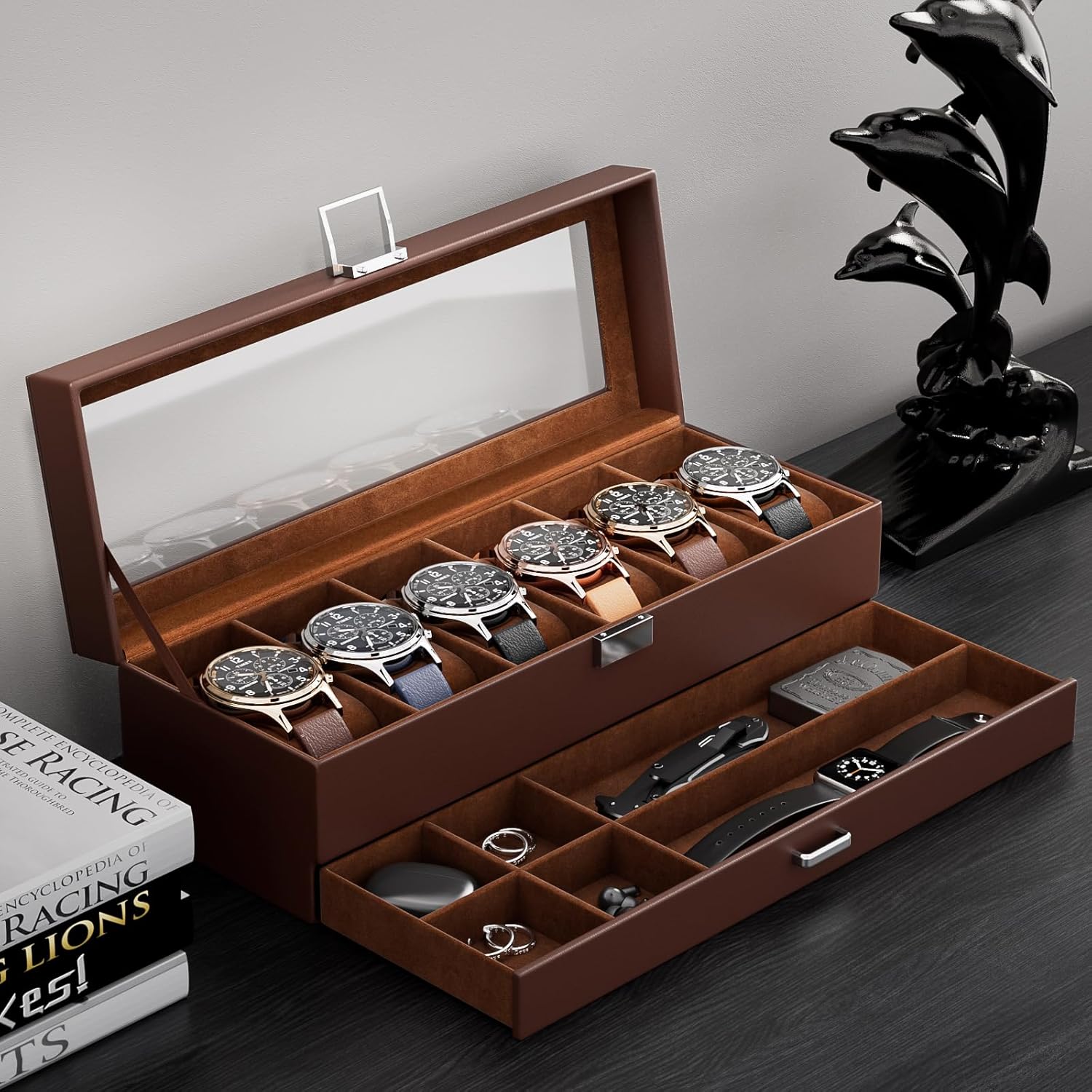 Keep All Things in One Place: The design of 2-layers with drawers can store 6 watches, also offers additional storage for watchbands, cufflinks, bracelets, rings, pens, necklaces, and other jewelry; protecting them against dampness, friction and loss