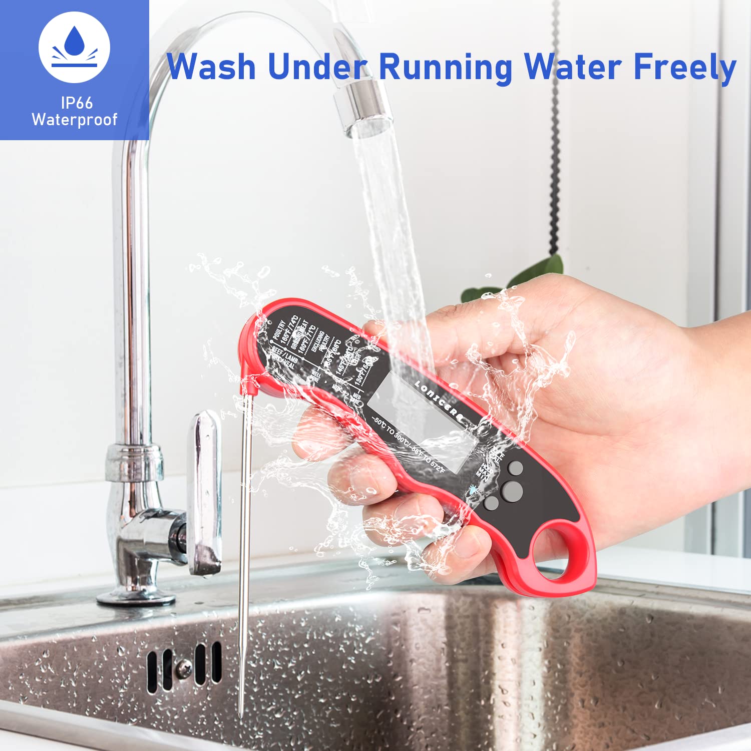 Lonicera Digital Thermometer for Cooking Food and Meat. Waterproof & Instant Read for Kitchen Baking, BBQ. with Foldable Probe, Backlight & Calibration (Red)