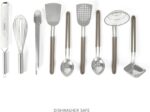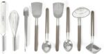WHAT’S IN THE BOX: One spider strainer, one rhombus ladle, one spoon, one slotted spoon, one turner, one slotted turner, one balloon whisk, one long grater, and one pair of tongs