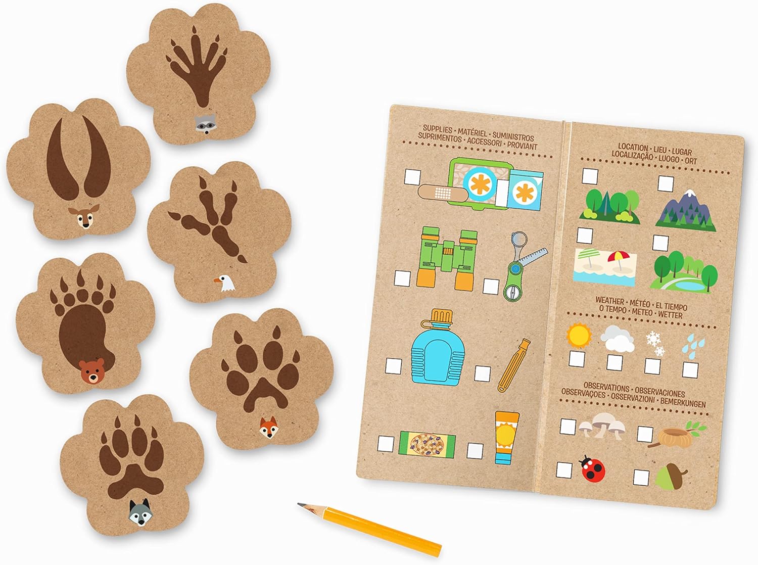 Hiking essentials include play first aid kit, play binoculars, sunscreen tube with flip-top, multi-tool (compass, magnifier, saw, ruler), durable canteen, wooden snack bar, 6 double-sided animal track cards, trail guide activity book, pencil