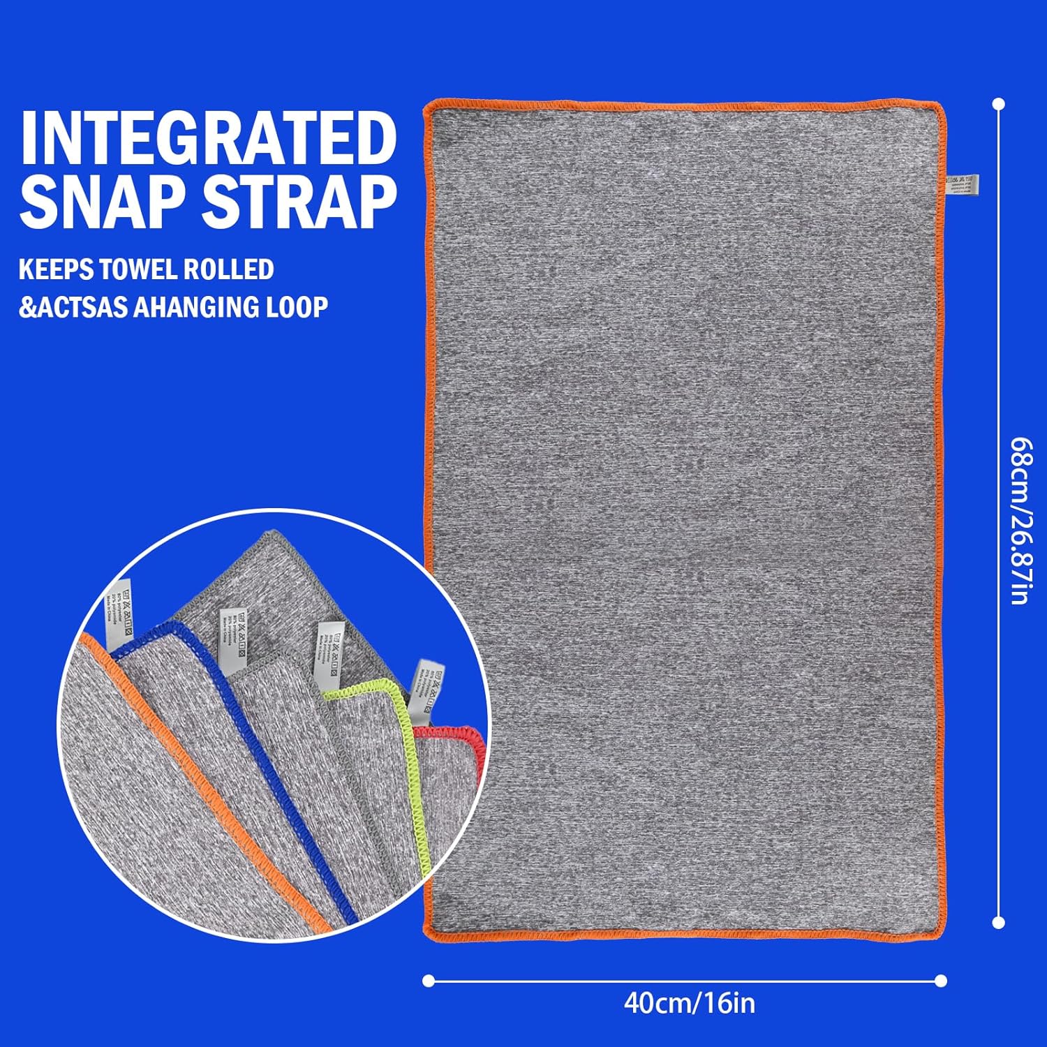 ULTRA COMPACT, LIGHTWEIGHT, STAY CLEAN WITH HANGING LOOP: With an integrated snap strap closure that doubles as a hanging loop over the door, your backpack, or bottle. the large thin towel rolls up into a packable travel-friendly size. Perfect for anyone who travels light.