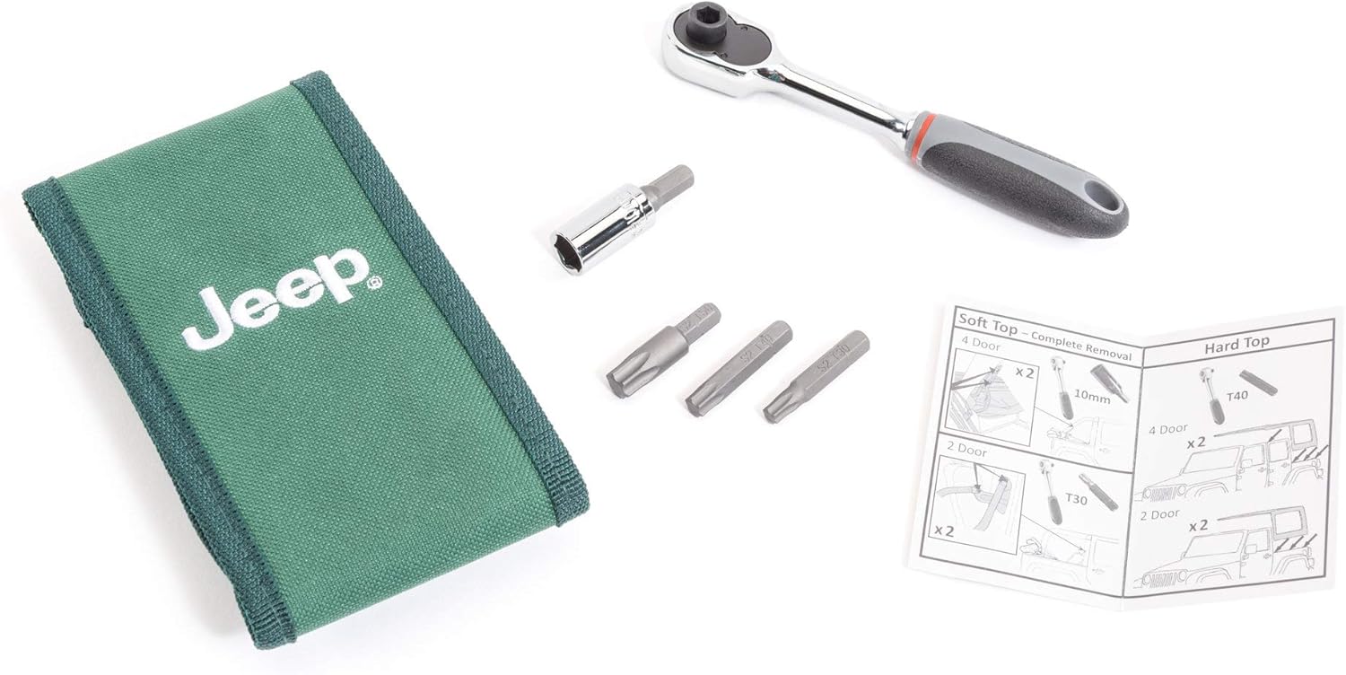 Jeeps are some of the most versatile vehicles on the road. You can easily change your Wrangler JL to fit the weather, and your mood with the Mopar Top and Door Removal Torx Set. This handy tool kit includes everything you need to remove your hardtop, doors, and fold down your windshield on the fly. Whether you need to make a trail-side fix, or you just want to enjoy the sun, this kit is for you. Convenient Design: Tool kit includes everything you need to remove your doors, hardtop, fold your windshield frame down, or many more. Official Licensed Product: The black nylon carrying case comes with an attractive embroidered Jeep logo. PARTS INCLUDED * 5-5/16″ Jeep Logo Ratchet * T40 Torx Bit (Long) * T50 Torx Bit (Short) * 15mm Socket * Instruction Card * Carrying Case FITMENT * Jeep Gladiator (JT) * 2021 Jeep Gladiator (JT) * 2020 Jeep Gladiator (JT) * Jeep Wrangler 2-Door (JL) * 2021 Jeep Wrangler 2-Door (JL) * 2020 Jeep Wrangler 2-Door (JL) * 2019 Jeep Wrangler 2-Door (JL) * 2018 Jeep Wrangler 2-Door (JL) * Jeep Wrangler Unlimited 4-Door (JL) * 2021 Jeep Wrangler Unlimited 4-Door (JL) * 2020 Jeep Wrangler Unlimited 4-Door (JL) * 2019 Jeep Wrangler Unlimited 4-Door (JL) * 2018 Jeep Wrangler Unlimited 4-Door (JL)