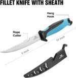 ✅Fillet Knife with Sheath – Overall Length: 10-1/2 inch. Ideal for detailed precision cutting and scaling, a super thin blade featuring a serrated edge on back side, allows for effortless remove meat without loss. Ergonomic handle grip with groove ensures non-slip during use, provide ultimate knife control and protect your fingers. A lanyard hole offers a better carry. Plastic sheath features with 2 inch knife sharpener, the belt clip makes it safer carry and protects the knife when not in use