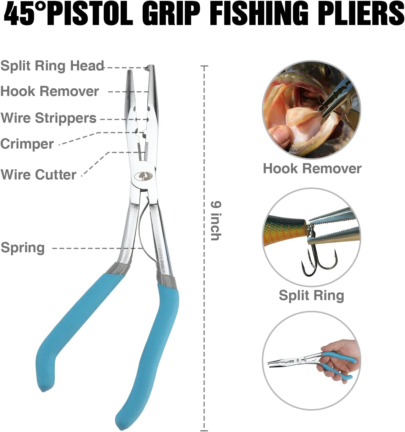 ✅45° Pistol Grip Fishing Pliers – Multi-purpose pliers include Split Ring Head, Hook Remover, Wire Strippers, Crimper, Wire Cutter for ordinary nylon fishing wire, carbon wire or iron wire. Three crimping slots are designed for different types of leads. Quickly remove hook or replace treble hook on your lure while catching fish or utilize the carbide cutters to cut fishing line or other fishing tasks. Spring non-slip grip handle avoids pliers slipping. Overall Length: 9 inches; Weight: 8 oz.