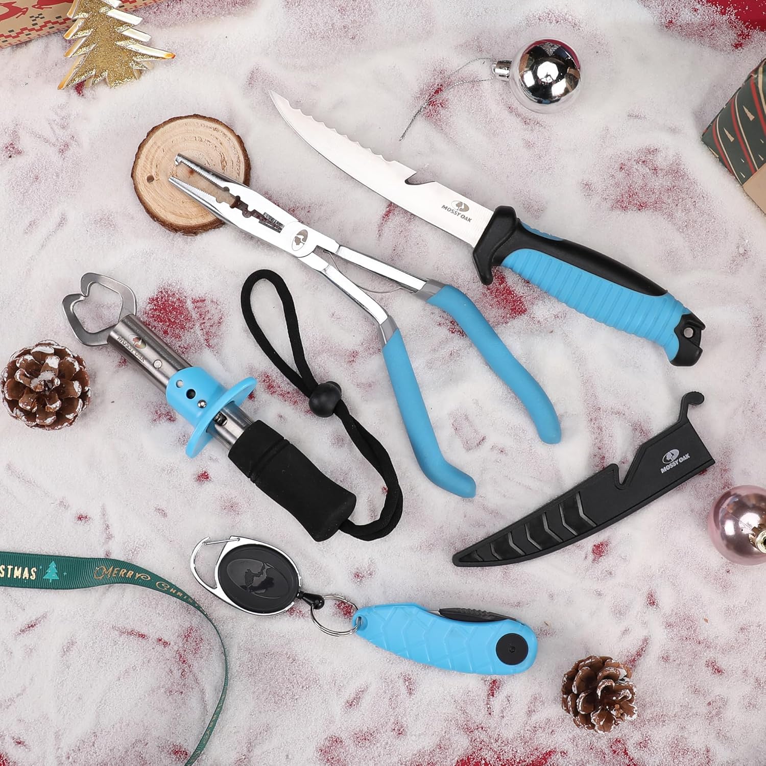 Mossy Oak 4pc Fishing Tool Kit – Pistol Grip Fishing Pliers, Fish Fillet Knife, Fishing Gripper, Line Snip, Fly Fishing Retractor with Retractable Lanyard