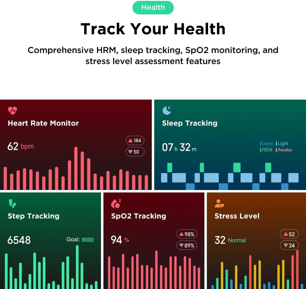 Advanced Health Monitoring – Stay on top of your health with comprehensive tracking features including heart rate, SpO2, and stress monitoring, providing you with valuable insights to maintain your well-being.