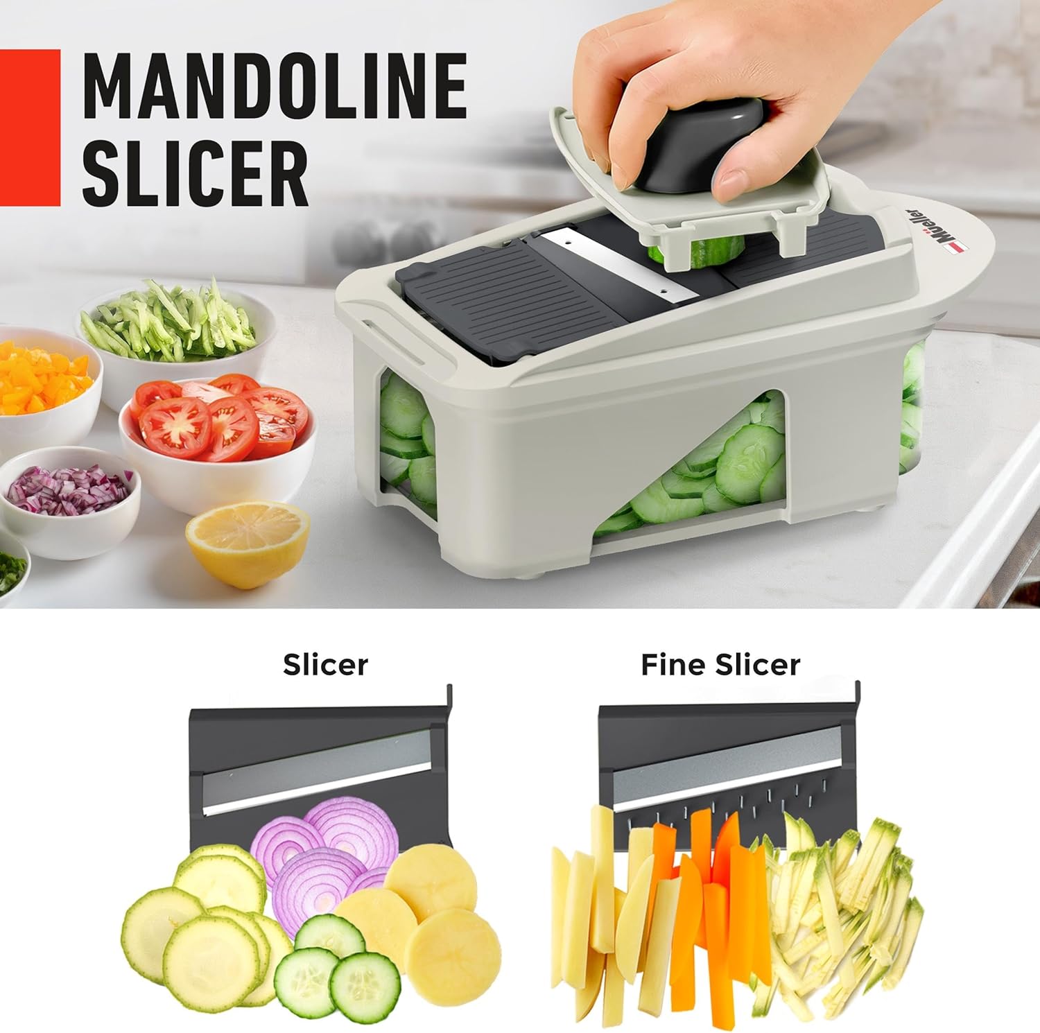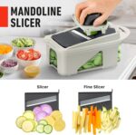 Mueller Pro-Series All-in-One, 12 Blade Mandoline Slicer for Kitchen, Food Chopper, Vegetable Slicer and Spiralizer, Cutter, Dicer, Grater, Kitchen Gadgets Sets with Container, White Sand/Gray