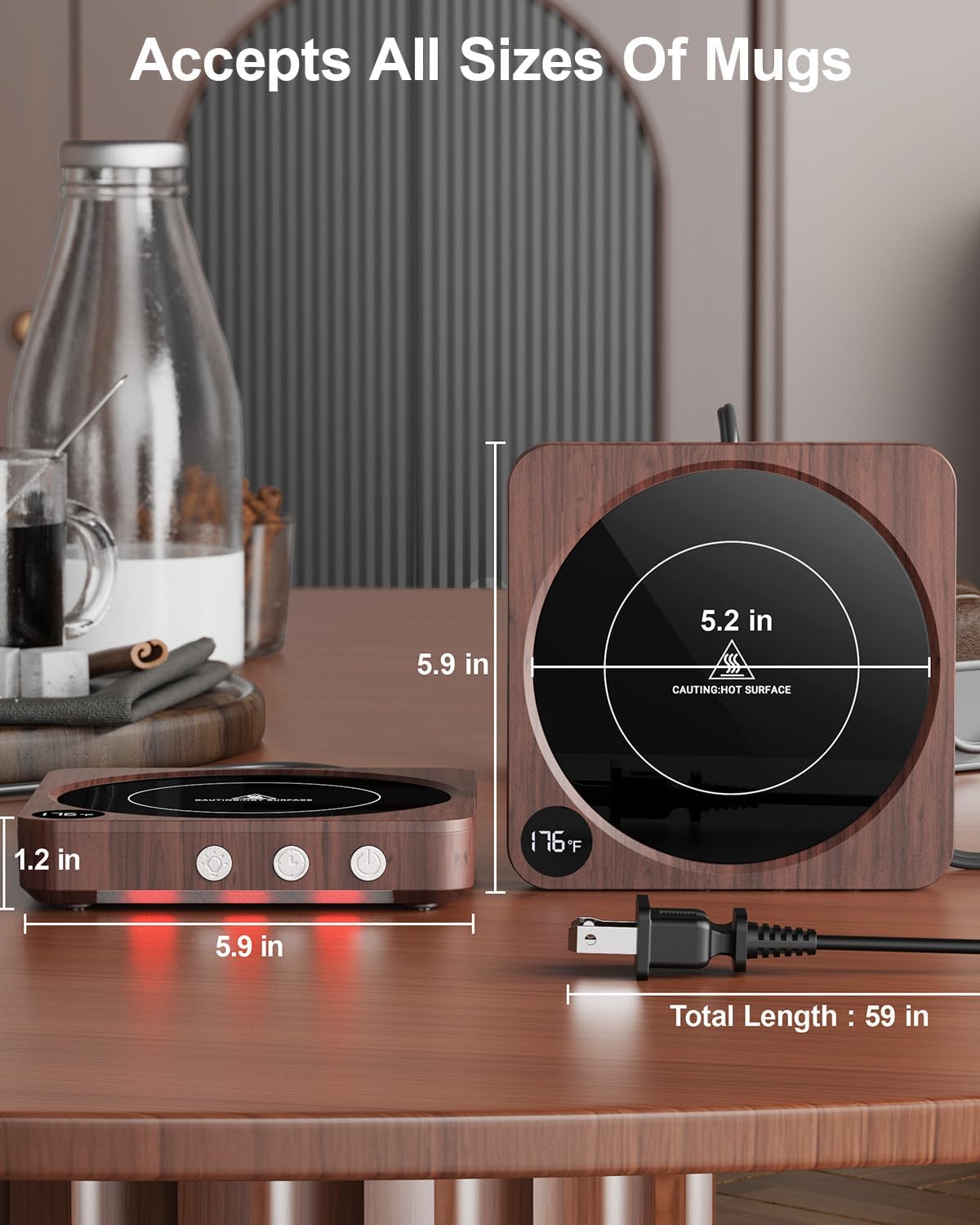 Larger Heating Panel: With a 5.2-inch heating plate area, coffee warmer for desk is suitable for 99% of cups and beverages. It accommodates most cup sizes, Our coffee heater can achieve a suitable temperature without flat-bottomed cups