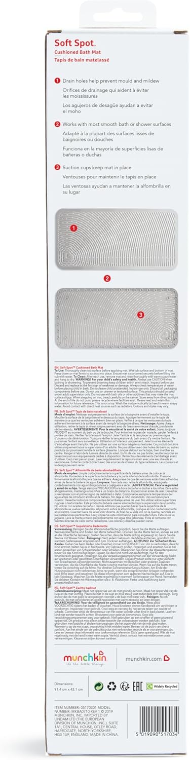Munchkin knows when it comes to bath time, safety comes first. Keep your little one from slipping and sliding with the soft spot cushioned bath mat. This safety bath mat has grooves throughout the design creating a sturdy grip and extra comfort. Strong suction cups keep this mat secure to the base of the tub or shower – This mat will work with most smooth surfaces. Great for babies, kids or adults Bath mat measures 36″ L x 17″ W.